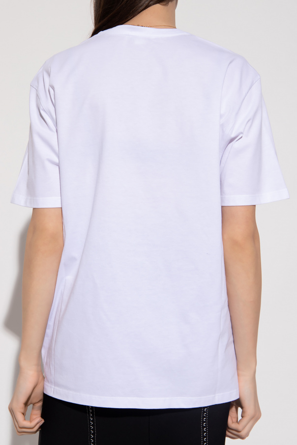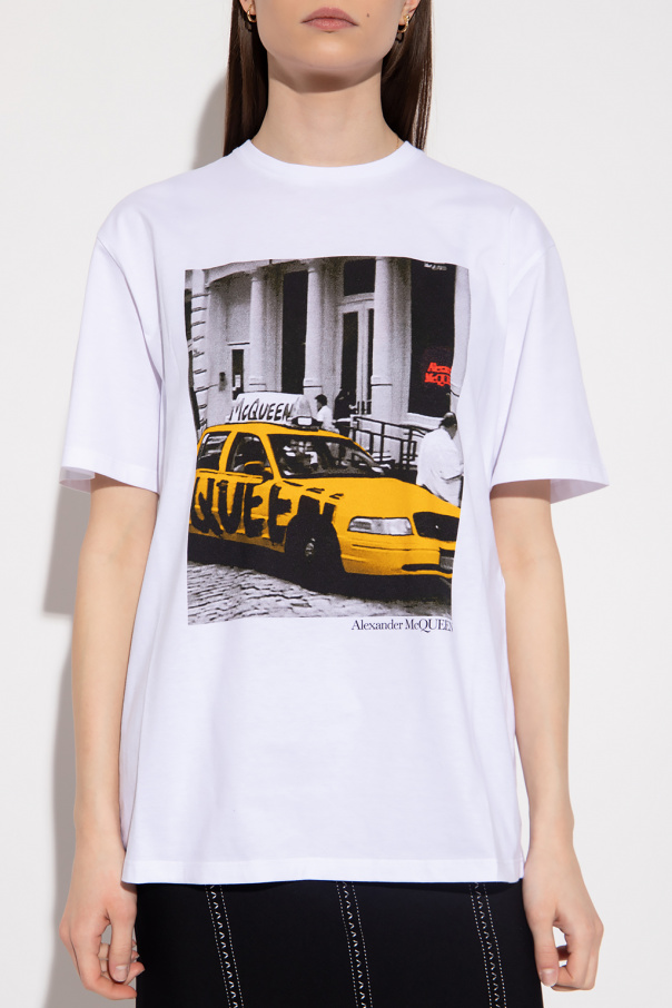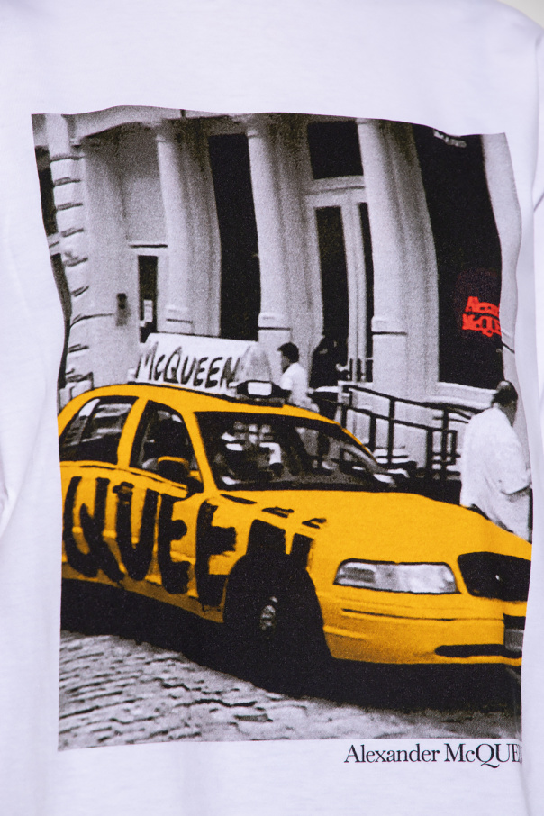 White crewneck T-shirt from Alexander McQueen. Made of cotton, this style features short sleeves, an elasticated collar and a colourful graphic print with the brand\'s logo on the front.