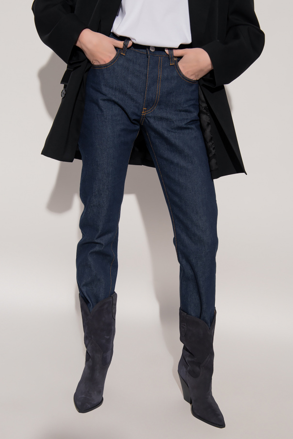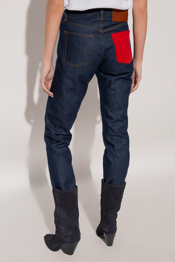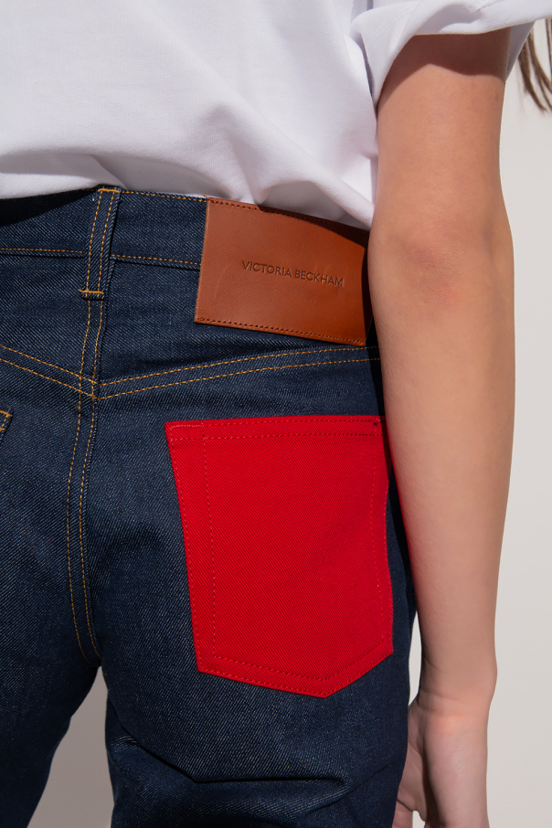 Navy high rise jeans from Victoria Beckham. Fastened with buttons, this slim fit pair falls down with five slip pockets as well as a red pocket and brown leather logo patch at the back.