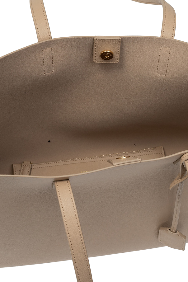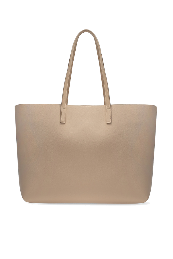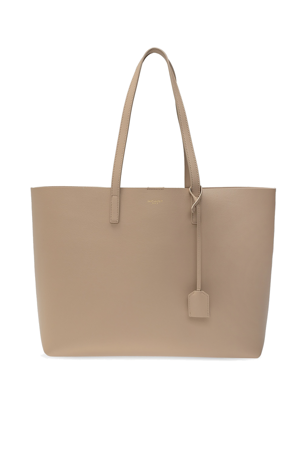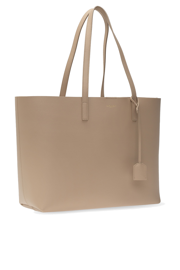 Beige shopper bag from Saint Laurent. Crafted from calf leather, this design features a magnetic snap fastening, silver-tone embossed logo, detachable charm and one internal compartment with a detachable zipped pouch on a strap.