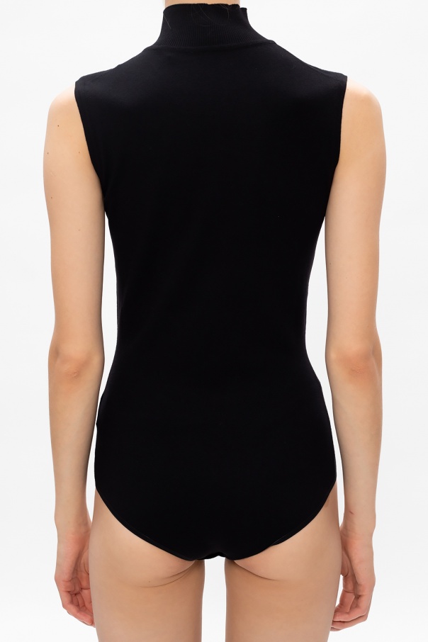 Black bodysuit from Alaia. Knitted from wool, this sleeveless design fastens via snap-buttons at the crotch and employs ribbed roll neck.