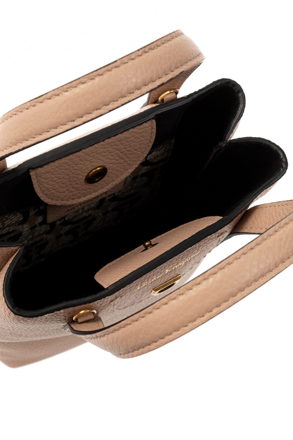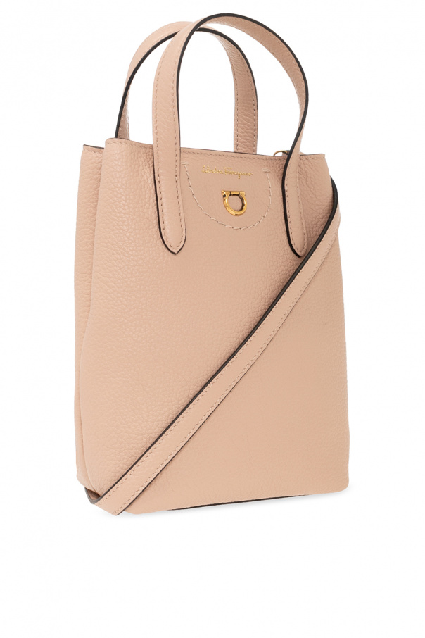 Beige shoulder bag from Salvatore Ferragamo. Crafted from calf leather, this design secures with a snap and showcases the brand\'s logo and signature Gancini symbol on the front, two half-round handles, a detachable and adjustable shoulder strap, gold-tone metal hardware and a black suede-clad interior with one compartment and one card slot.