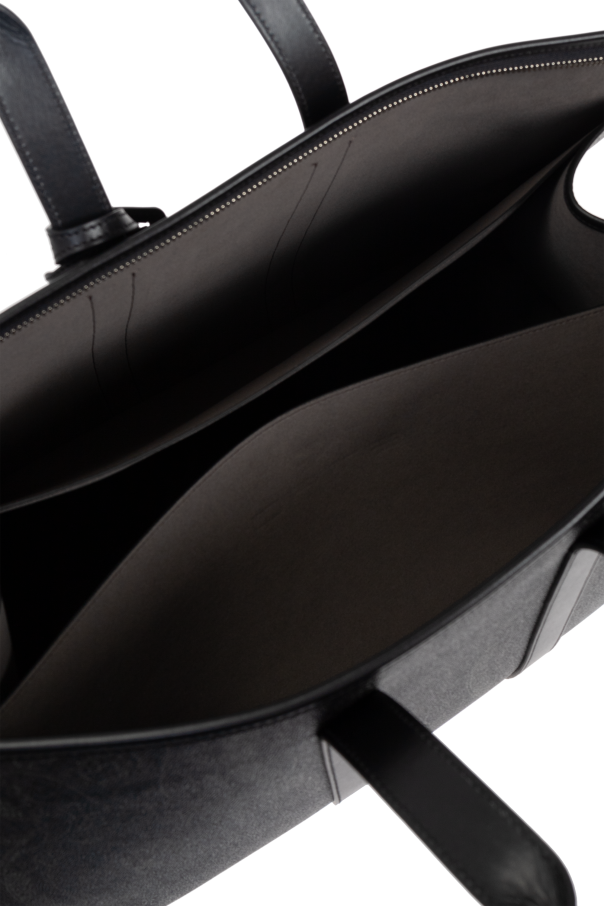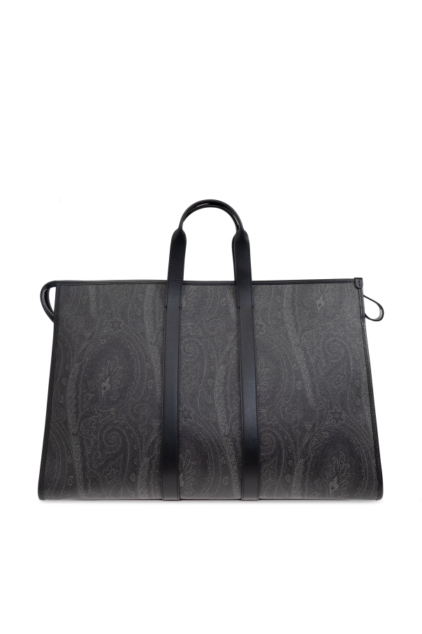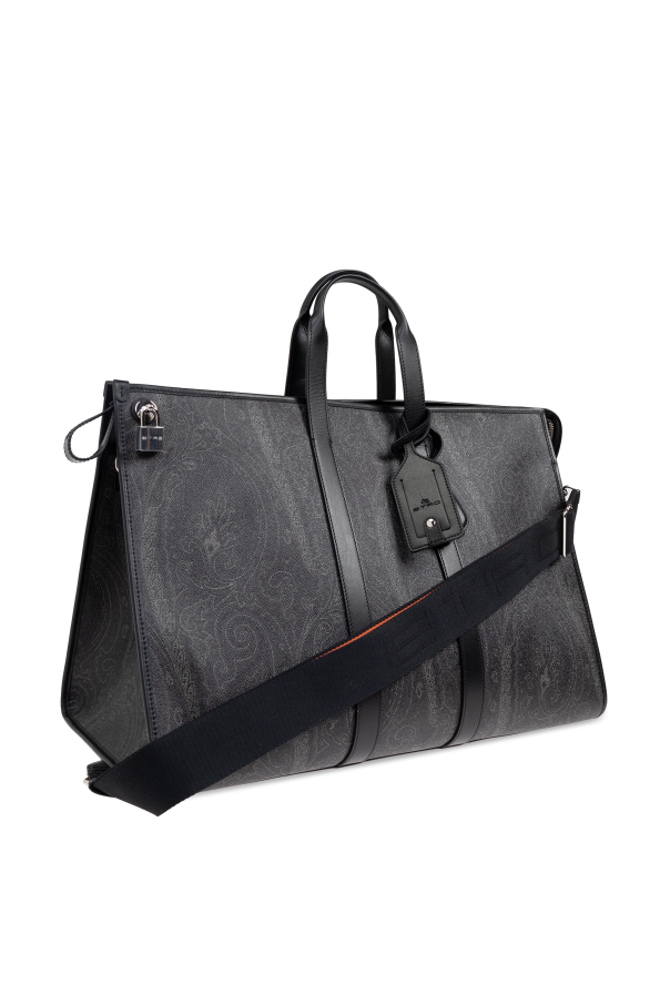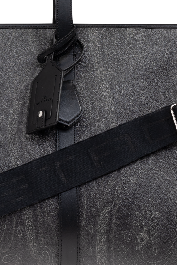 Introducing the luxurious carry-on bag from the exclusive collection of the renowned designer, Etro. This masterpiece embodies the elegance of Italian craftsmanship, seamlessly blending the opulence of paisley—a motif inspired by Indian culture—into its design. The bag boasts a rectangular silhouette with bold, geometric lines, complemented by a subtle paisley pattern that exudes sophistication. Crafted from premium leather and canvas, it features a gentle sheen that enhances its refined appearance. The dominant dark gray hue, contrasted with vertical black stripes, adds a touch of modernity and elegance. Details include a sleek, adjustable shoulder strap adorned with the brand\'s logo, an elegant leather handle for hand-carrying, and a secure zipper closure with silver-toned metal accents. Inside, the bag reveals a spacious compartment with two slip pockets, offering practicality for travel. Why Choose This Product? Exquisite design by the illustrious Etro, a symbol of Italian luxury. Versatile dark gray color with a timeless paisley motif. High-quality materials ensure durability and elegance. Spacious interior with organized compartments for practicality. Perfect blend of style and function for the discerning traveler.
