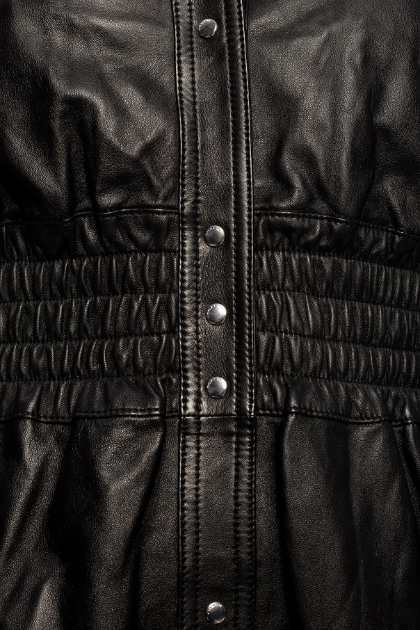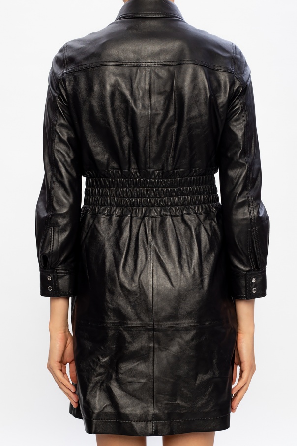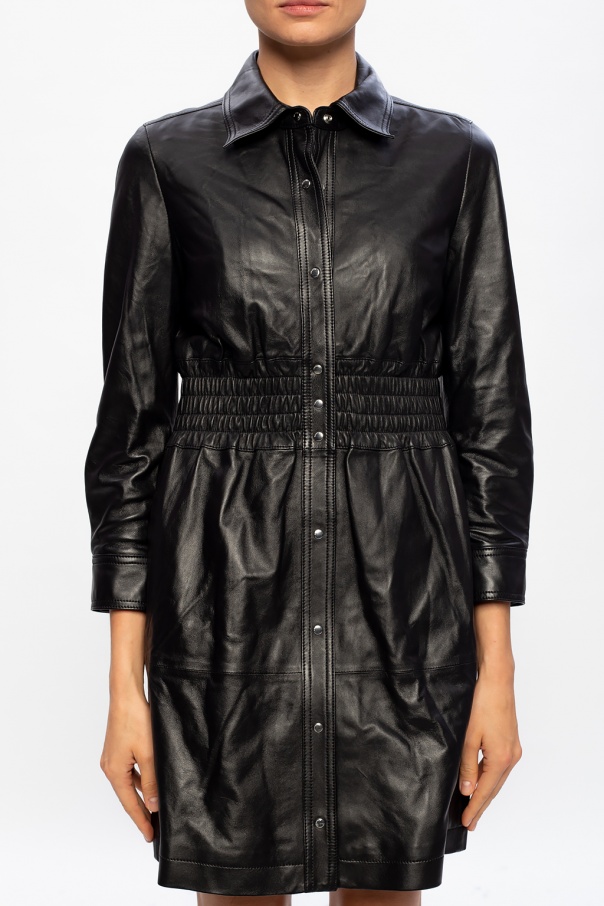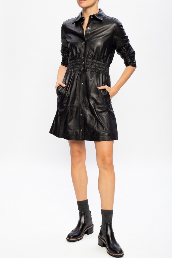Black dress from Coach. Crafted from lamb leather, this statement-inducing garment fastens via press-studs and employs long sleeves, two side pockets and distinctive smocking at the waist.