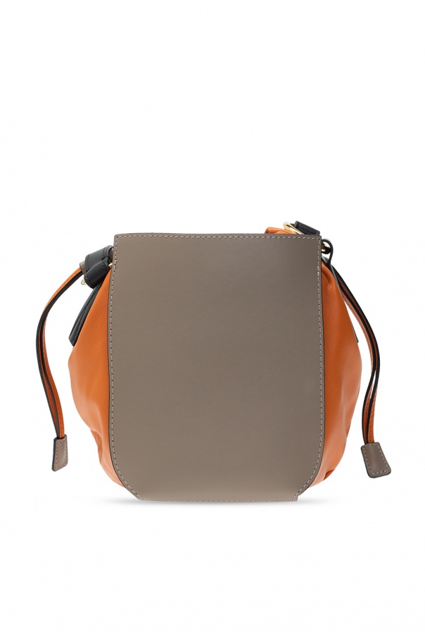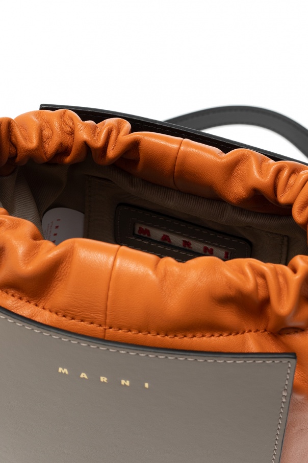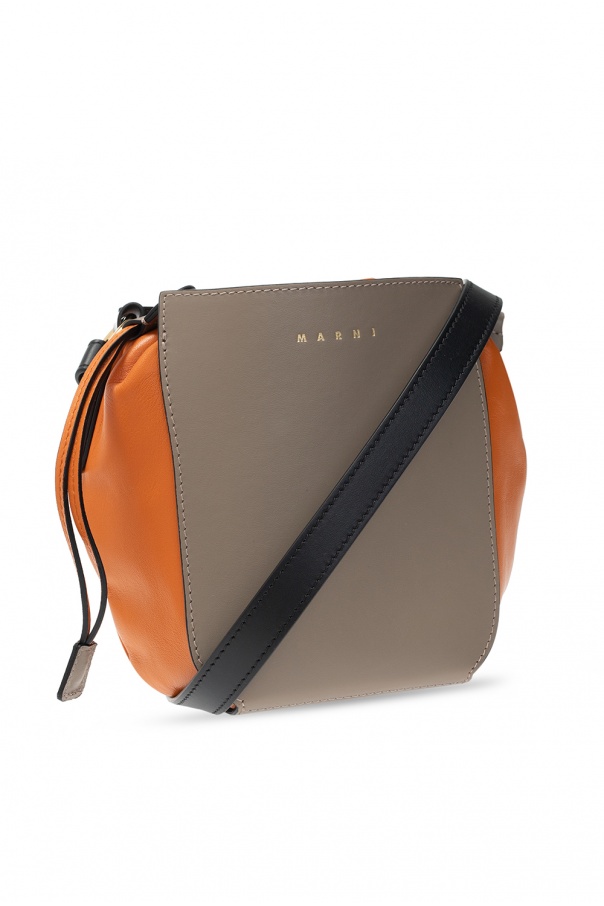 Orange and grey bucket bag from Marni. Fastened with drawstrings, this item features a gold-tone logo print, slip pocket on the front, adjustable shoulder strap, beige lining and a main internal compartment.