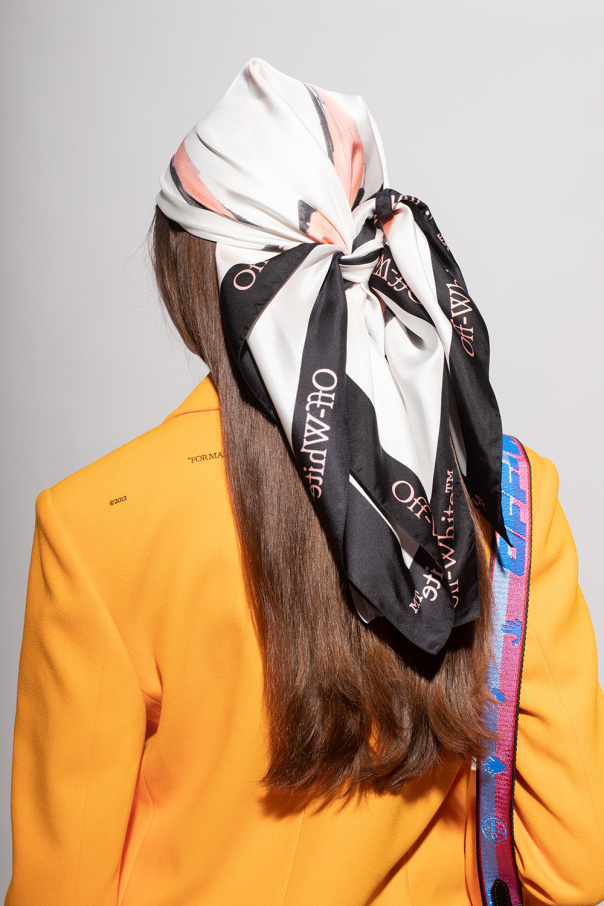 White, pink and black scarf with a logo from Off-White. Made of silk.