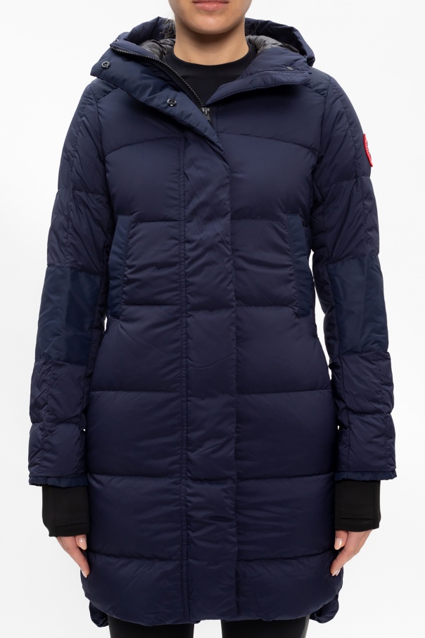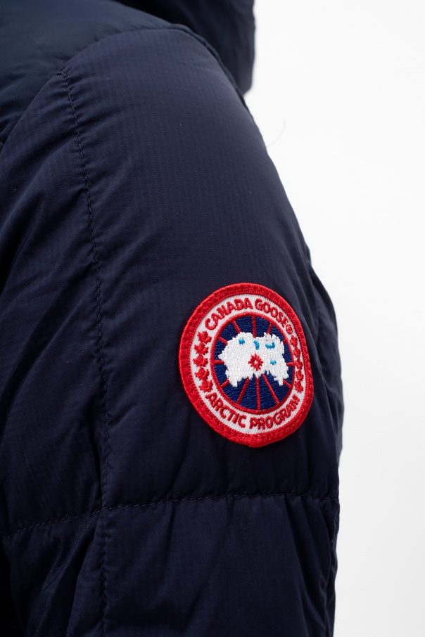 Navy ‘Alliston’ quilted down jacket from Canada Goose. Fastened with a two-way zip and snaps, this garment is complete with a drawstring hood, two zip pockets, two snap pockets and a logo patch in red, navy and white on the sleeve. Temperature rating: 0°C to -15°C.