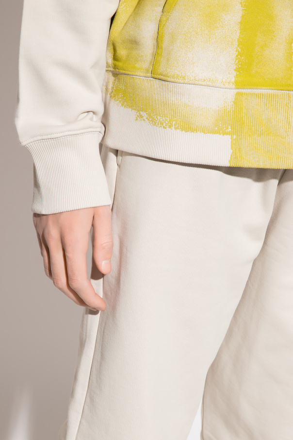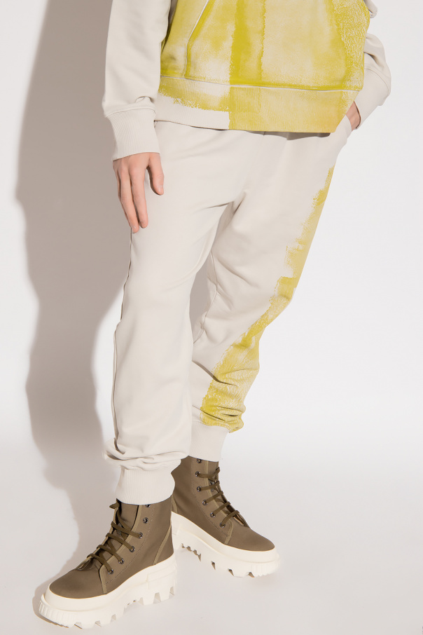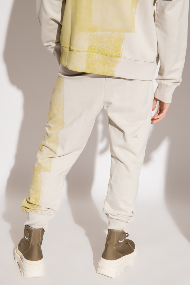 Greyish cream sweatpants from A-COLD-WALL*. Made of cotton, this pair features an elastic waistband with drawstring hood, green logo print, two slip pockets and one zip pocket.