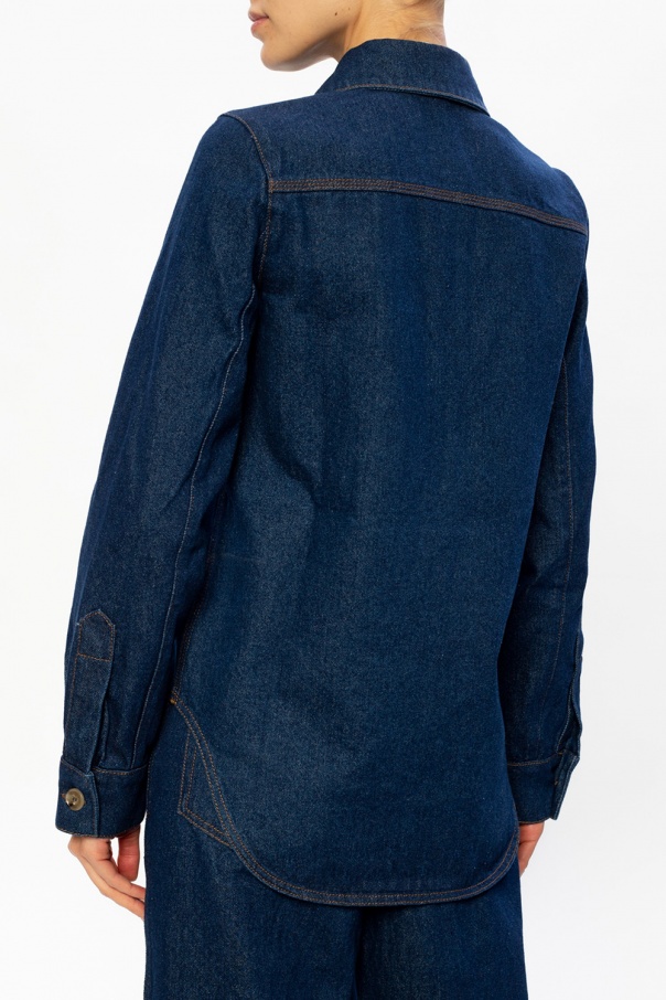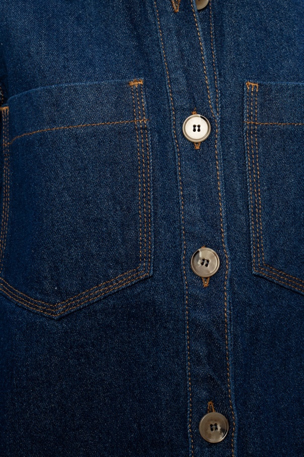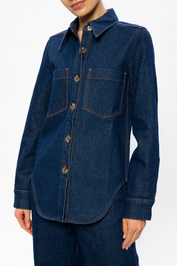 Dark blue denim shirt from Nanushka. Crafted from cotton, this style fastens via buttons and employs two patch pockets on the front, exposed orange stitching details, a pointed collar and long sleeves with button-fastened cuffs.