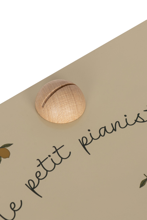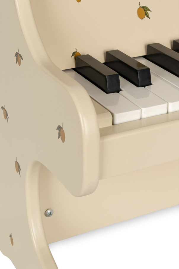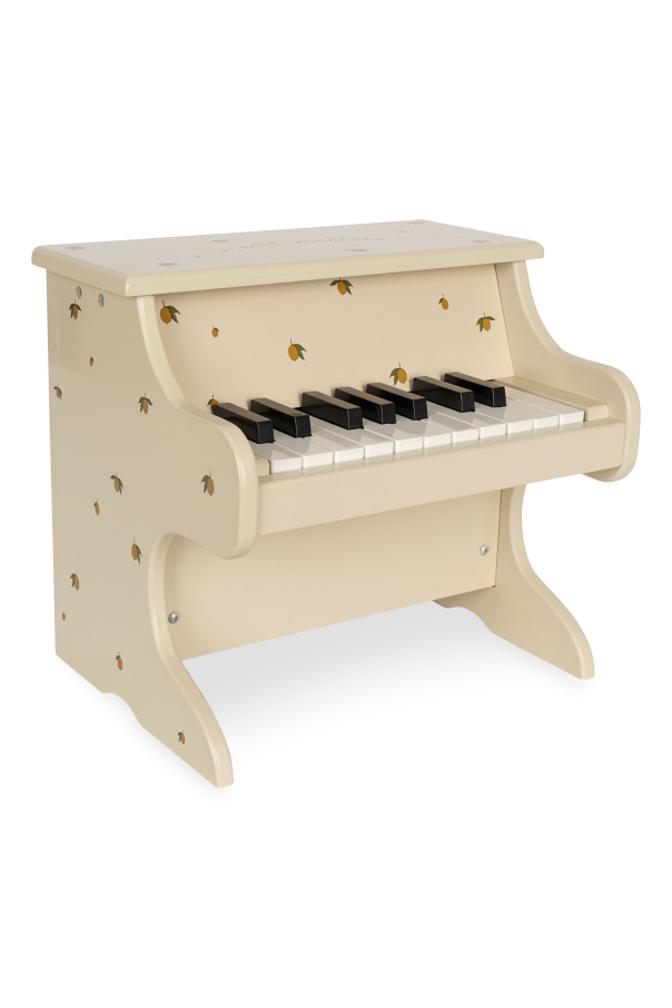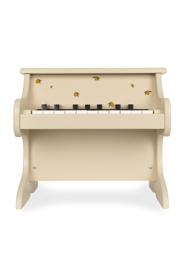 Cream miniature piano from Konges Slojd. Made in FSC certified MDF chipboard, this item showcases a lemon print accompanied by lettering and ABS keys. Comes with a small wooden holder for notes. Approved for children at the age of +3 years old.