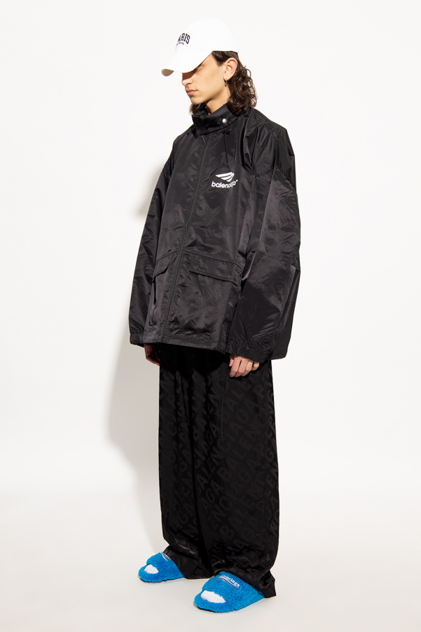Blue furry slides from Balenciaga. Resting on a black rubber sole, this pair is decorated with a logo embroidery in white and red.