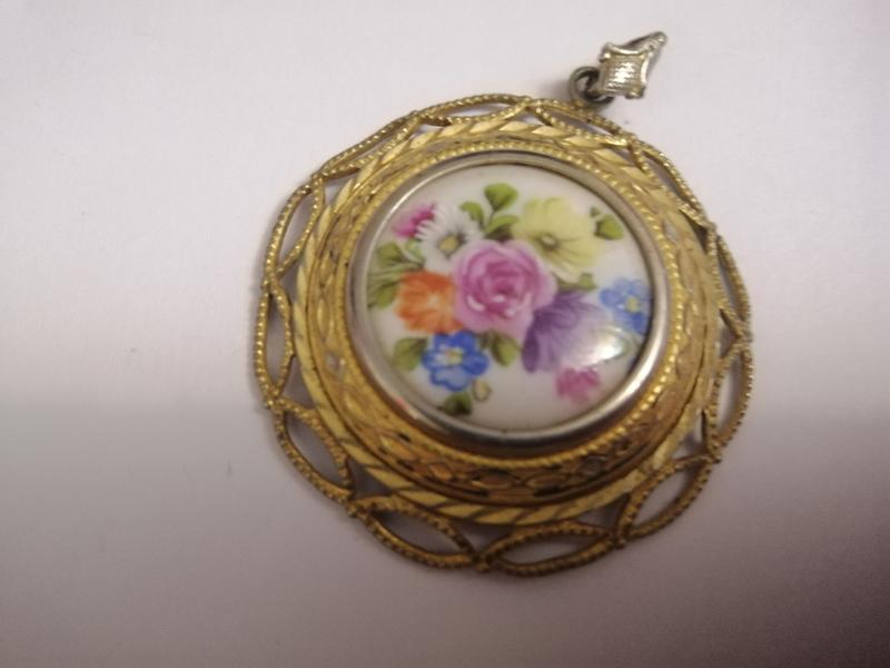 металл желтого и серого цветов, вставка похоже на керамику или фарфор с росписью.
