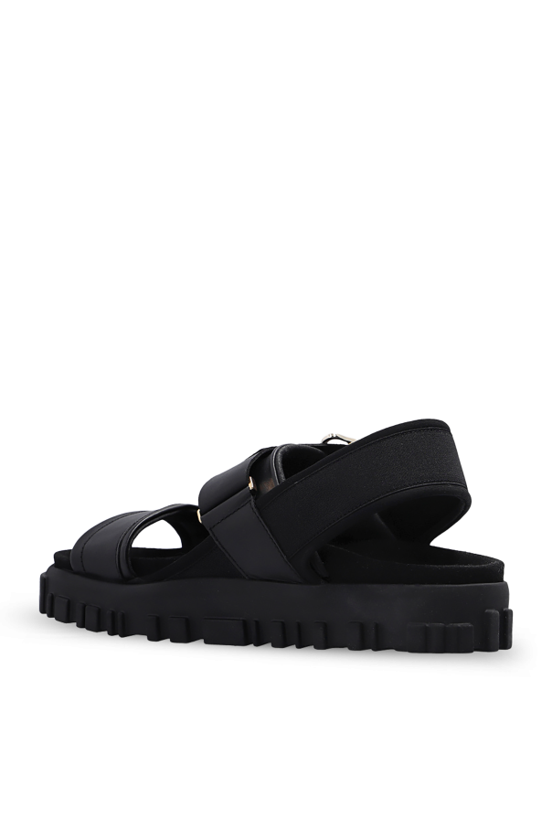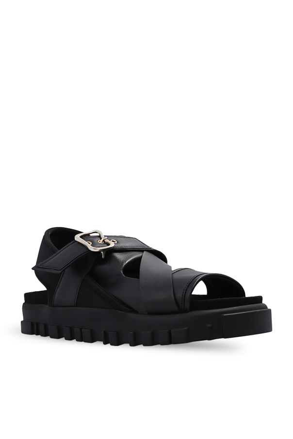Black ‘National’ sandals from Holzweiler. Crafted from leather with fabric trims, this pair features a strap with a gold-tone buckle, anti-skid insole and black rubber sole.