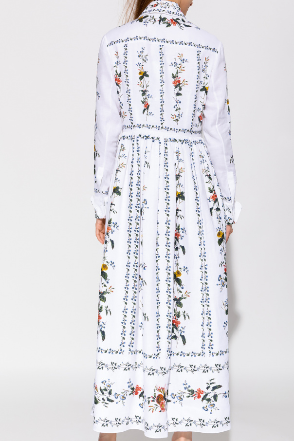 Long, white ‘Cora’ dress from Erdem. Made of linen, this design features button fastening, multicolored ‘Carrington Vine’ floral motif, fitted top with a collar and long sleeves with button cuffs as well as a flared skirt with two pockets.