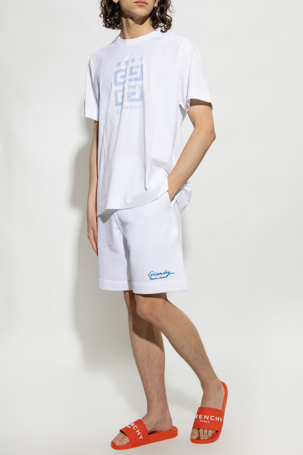 White shorts from Givenchy. Made of cotton, this pair is cinched with drawcords at the waist and showcases a blue graphic print with the brand\'s logo, two slip pockets and one snap-fastened pocket.