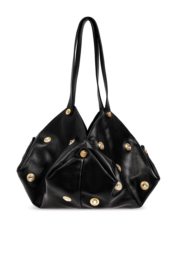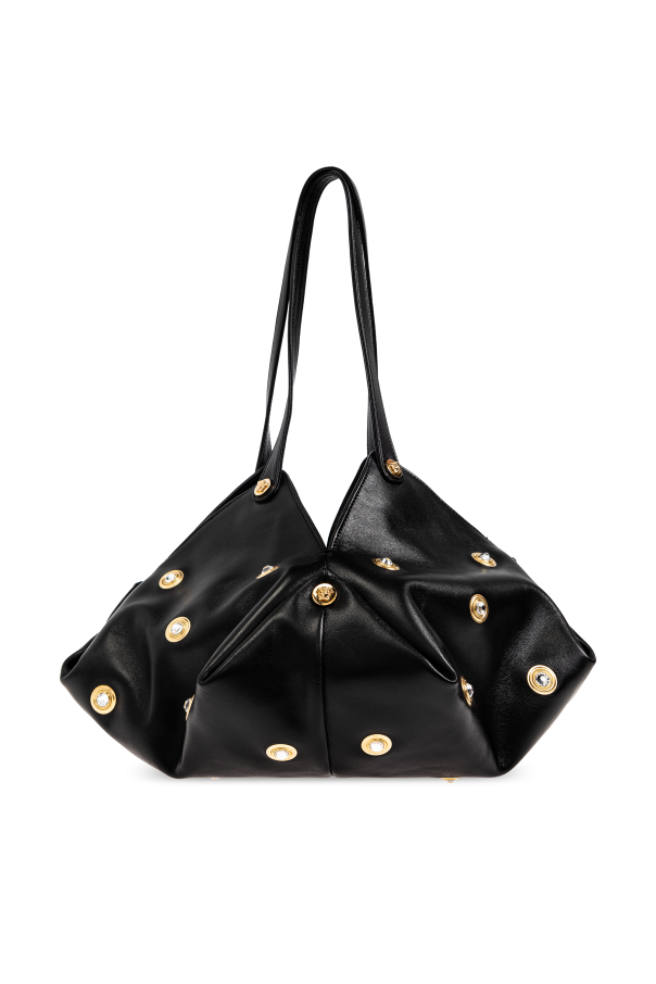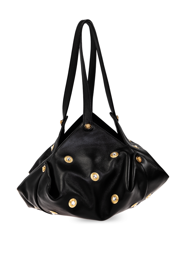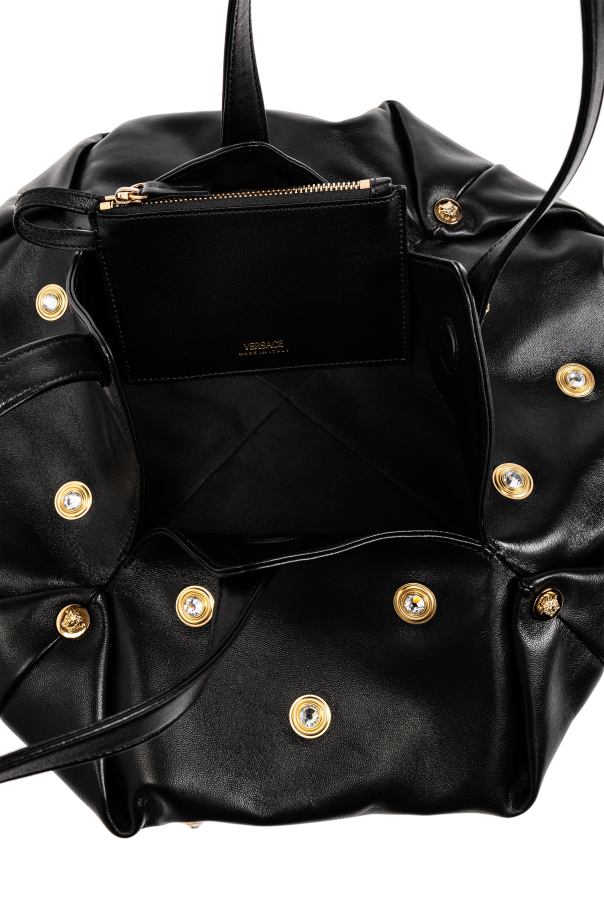 Behold the Protea, a sublime creation from the legendary house of Versace. This black handbag, a paragon of elegance, is crafted from exquisite high-quality leather, ensuring both durability and a luxurious touch. Its unique silhouette, adorned with intricate pleats and opulent gold embellishments, exudes sophistication. The Protea offers versatility with its two elongated handles, allowing it to be gracefully draped over the shoulder. Inside, it reveals a spacious interior complete with a zippered pocket for your essentials. External features, such as the gold buttons, may proudly display the designer\'s emblem, underscoring the exclusivity of this masterpiece. Why Choose This Product? Iconic design by the renowned Versace. Luxurious high-quality leather construction. Exquisite gold accents for a touch of opulence. Spacious interior with a secure zippered pocket. Versatile carrying options with dual long handles.