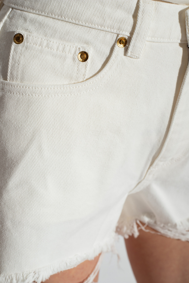 White high-waisted denim shorts from Golden Goose. Fastened with a zip and button, this pair features a logo appliqué at the back, three front pockets, two back pockets and raw cut edges.