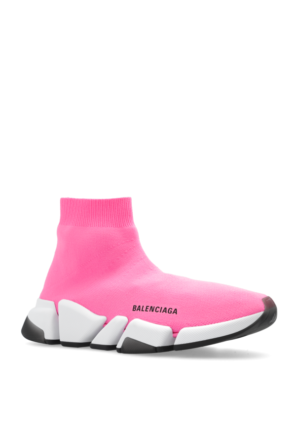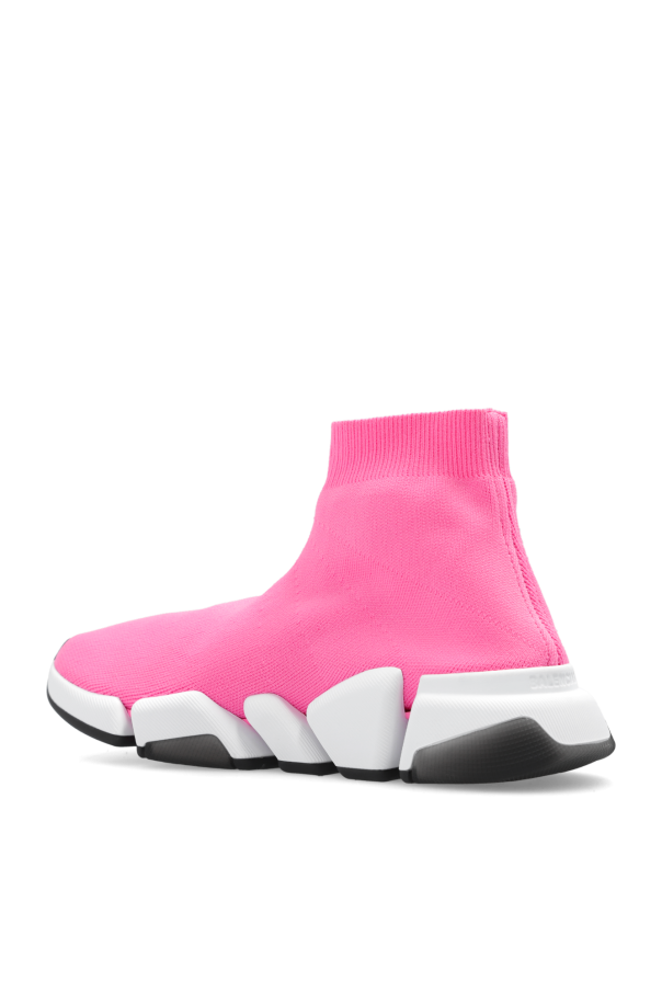 Pink \'Speed 2.0\' sneakers from Balenciaga. Made from technical knit, this model sits on a black rubber sole and showcases a printed black logo and a sock-like edge.
