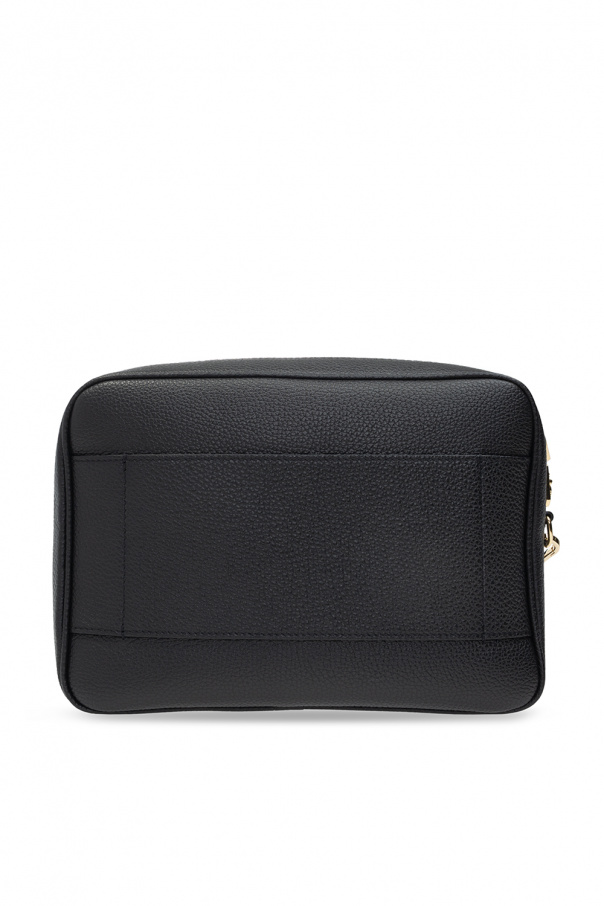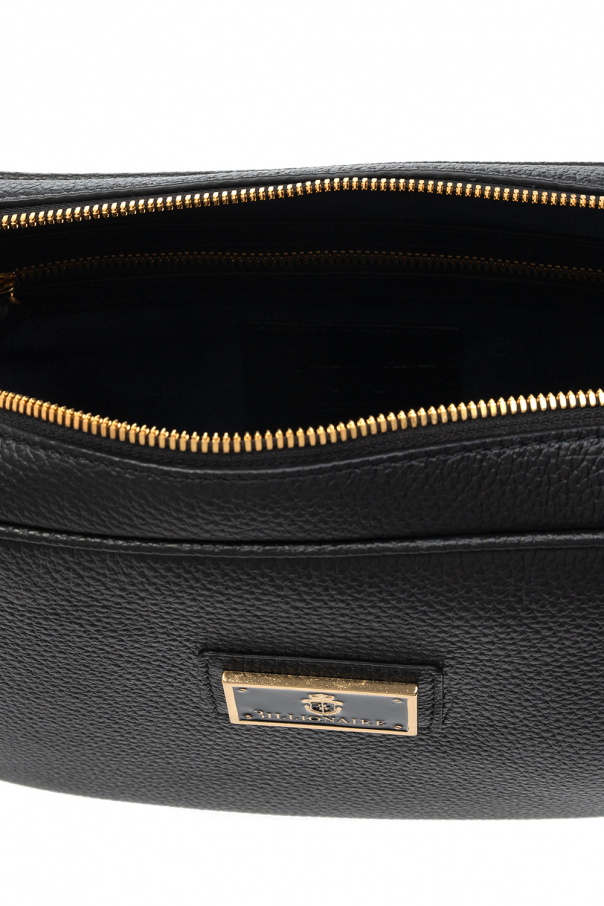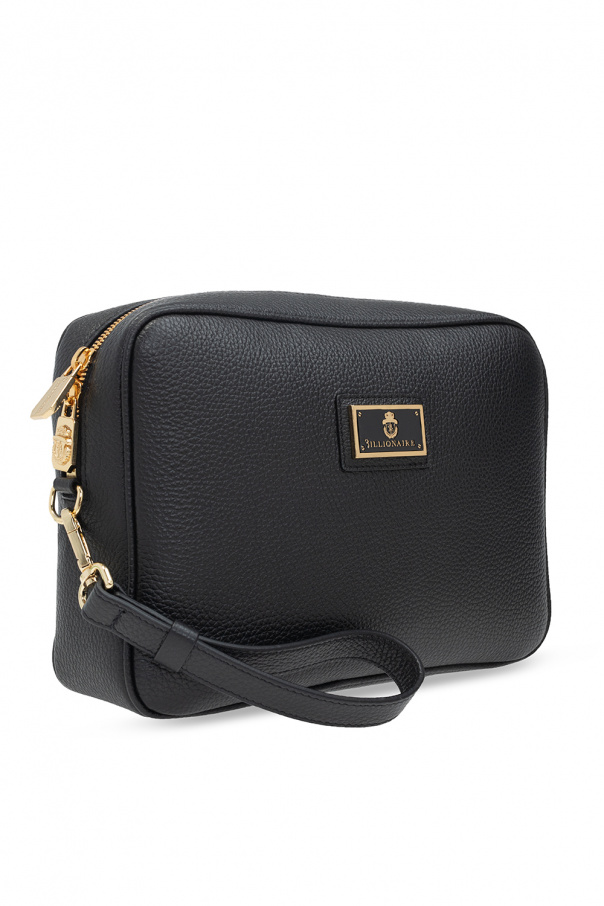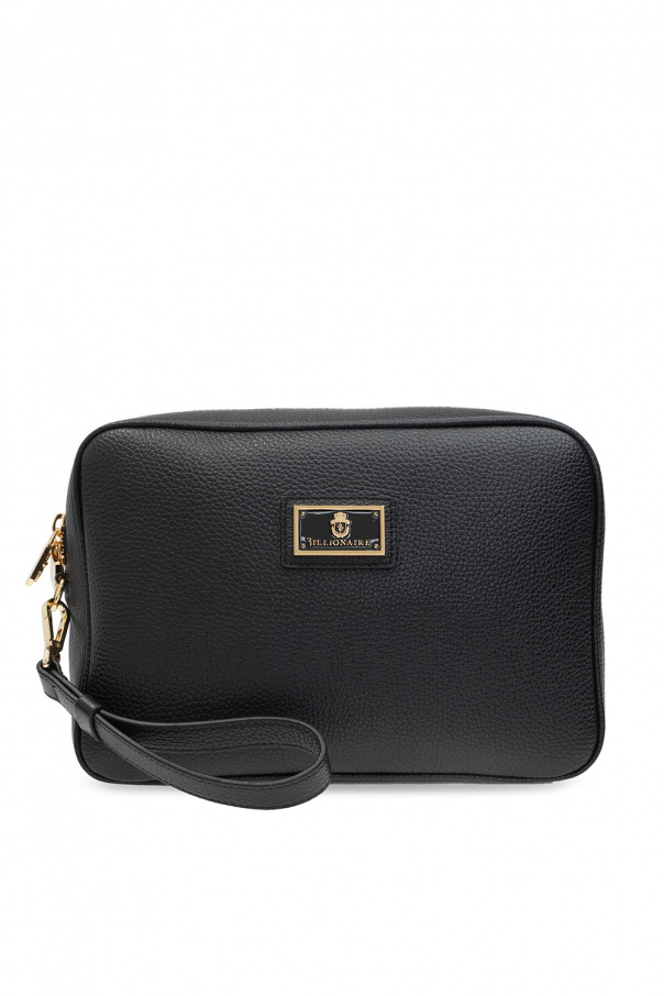 Black wash bag from Billionaire. Crafted from grained calf leather, this item fastens with a two-way zip and is decorated with a metal logo appliqué. It is complete with a back slip pocket, wrist strap, gold-tone metal hardware and one internal compartment with navy lining, one zip pocket and one slip pocket.
