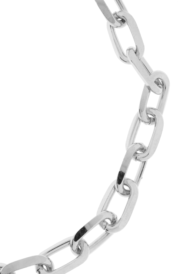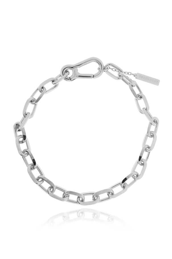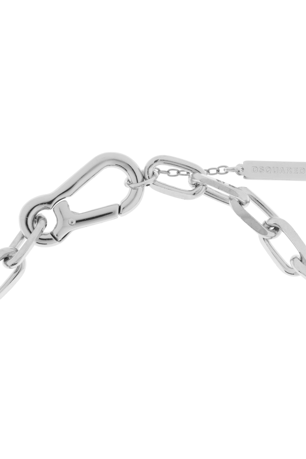 Introducing the Chain Necklace by the illustrious Dsquared2, an emblem of sophistication and cutting-edge design. This striking piece, crafted from high-gloss aluminum, features robust rectangular links that evoke an industrial elegance, rendering it a quintessential statement in men\'s jewelry. The necklace\'s modern allure is further accentuated by its sleek carabiner clasp, while a distinctive designer-engraved pendant graces one of the links, underscoring its exclusivity. Bathed in a lustrous silver hue, this accessory effortlessly infuses any ensemble with an air of refined luxury. Why Choose This Product? Exquisite Design: Bold rectangular links create a contemporary, industrial aesthetic. Designer Prestige: Featuring the signature of Dsquared2, known for blending American glamour with Italian chic. High-Quality Material: Made from 100% aluminum with a high-gloss finish. Versatile Elegance: A perfect complement to both casual and formal attire.