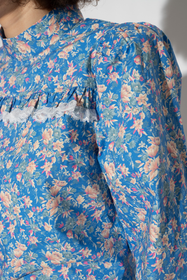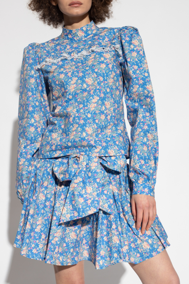 Blue ‘Diem’ top from Custommade. Crafted from organic cotton, this style features a colourful floral motif, blouson sleeves and button closures at the back.