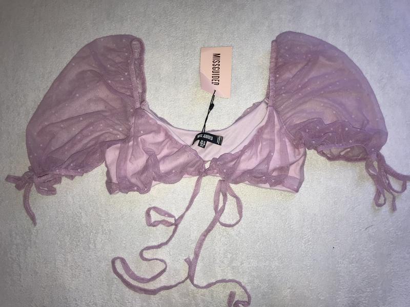 Роскошный бралетт из стрейч-сетки от Missguided. Завладевает спереди шнурочками. Перчатки объемные фонарики на резинках. На подкладке. 96% полиэстер, 4% эластан. Цвет лиловый. Очень нежный!!