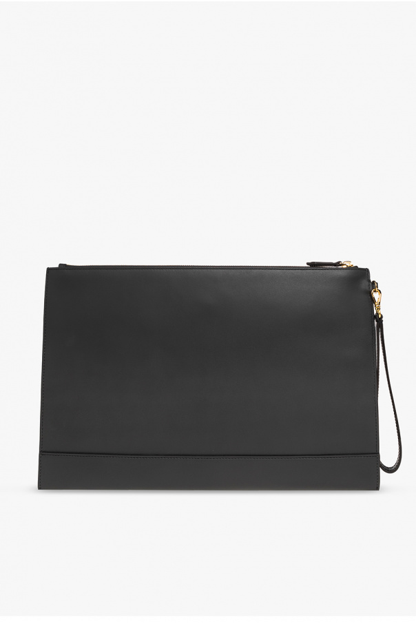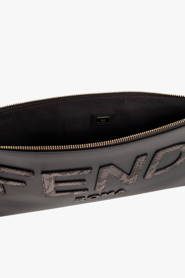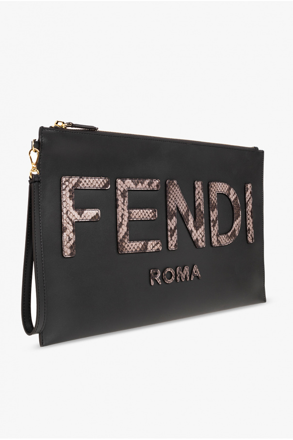 Dark grey clutch from Fendi. Crafted from calf leather, this item features a zip fastening, snakeskin appliqué with a logo, detachable wrist strap, one internal compartment and gold-tone metal hardware.