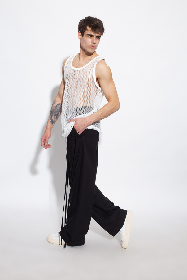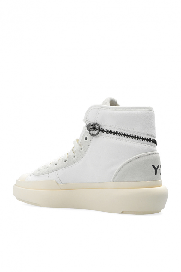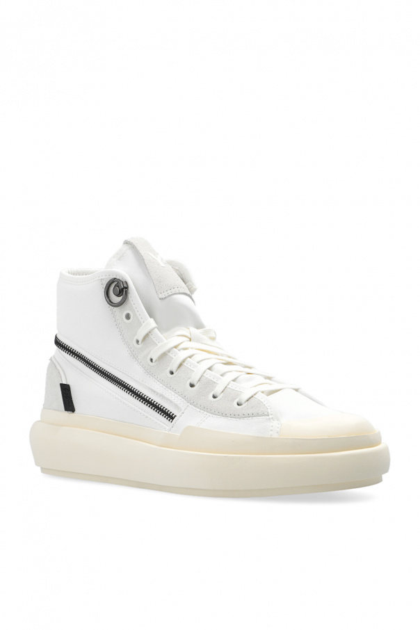 White and cream ‘Ajatu’ sneakers from Y-3 Yohji Yamamoto. Crafted from fabric and leather, this lace-up model features a high-top silhouette with a distinctive zip fastening, a back logo print and a cream rubber sole.