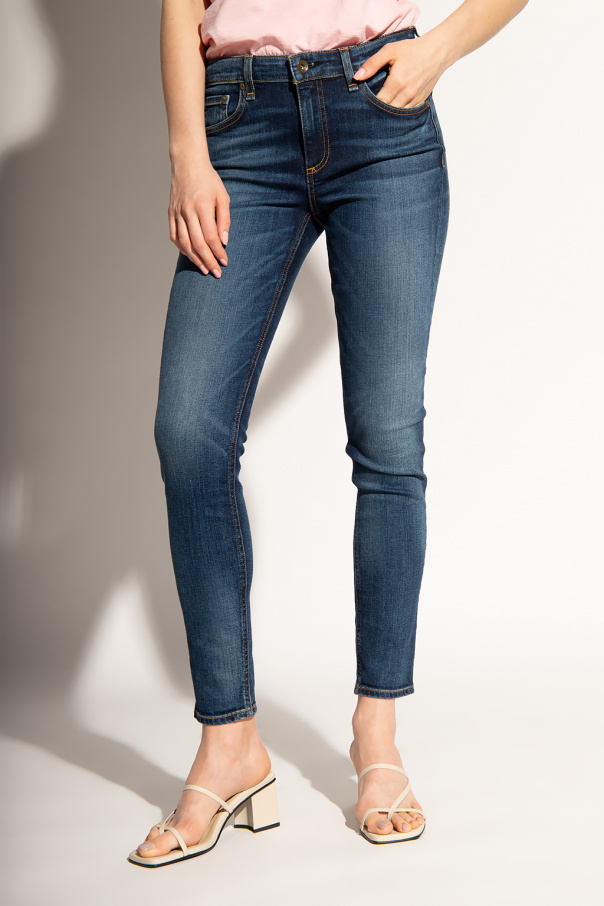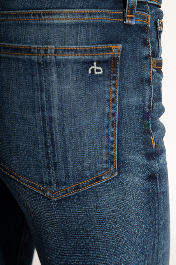 Navy distressed jeans from Rag & Bone. Crafted from cotton, this tapered leg design is complete with a zip fly with a button and five slip pockets.