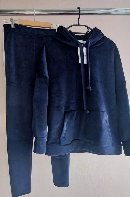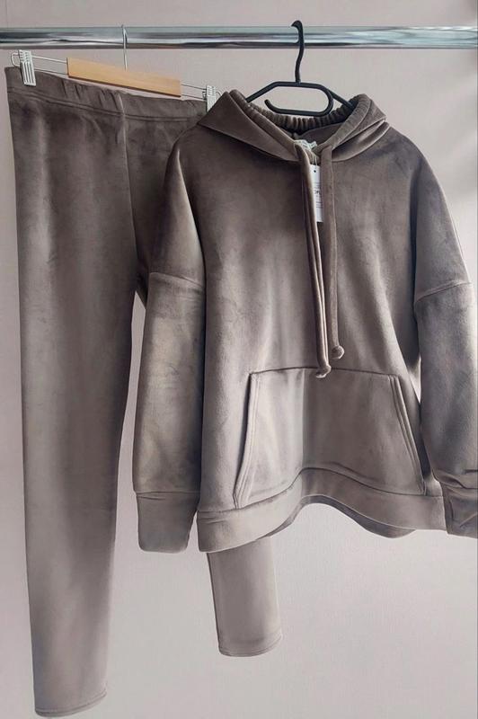 Костюм теплый из плотного двойного велюра, ткань эластичная, не заплатится, хорошо держит форму.Худи с удобным капюшоном, в котором есть шнурок из основной ткани, карман "кенгуру", на манжетах в рукаве есть разрез для пальца. Лосины с высокой посадкой, без боковых швов,пояс на резинке.Состояние: НовоеЦвет:- Коричневый