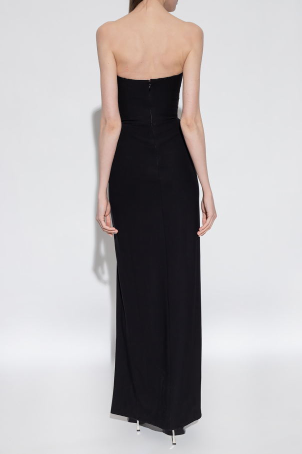 Black strapless dress from Nensi Dojaka. Cut with a form-fitting silhouette with boning detailing and contoured cups, this style features a hidden back zipper with a hook & eye closure and a frontal slit.