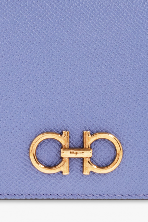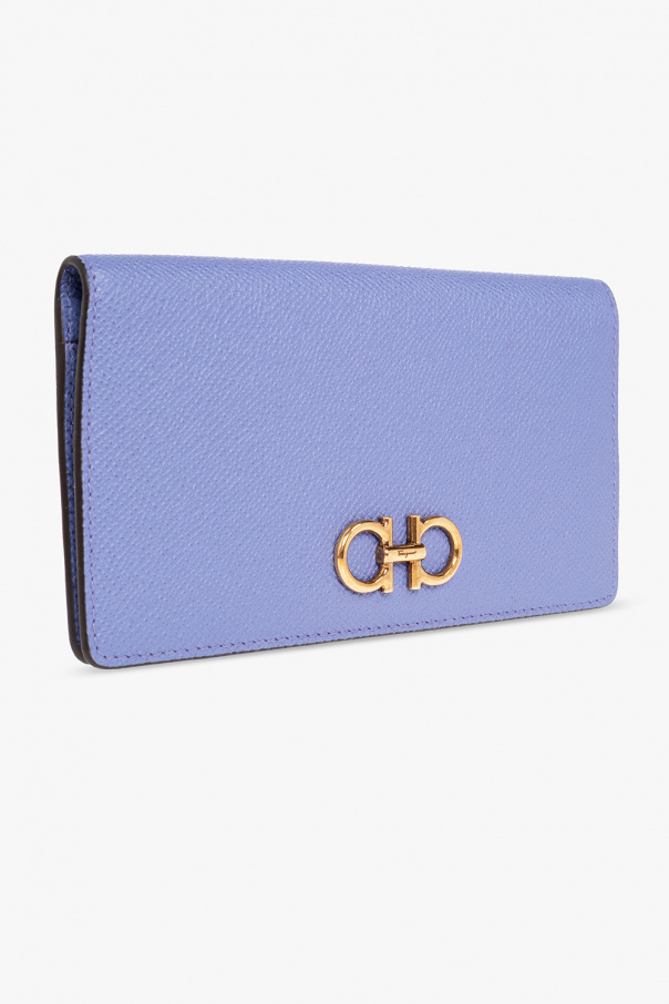 Purple card case from Salvatore Ferragamo. Crafted from calf leather, this design secures with a snap and features a logo application, silver-tone metal hardware, a back zip pocket and 14 card slots and 4 slip pockets inside.