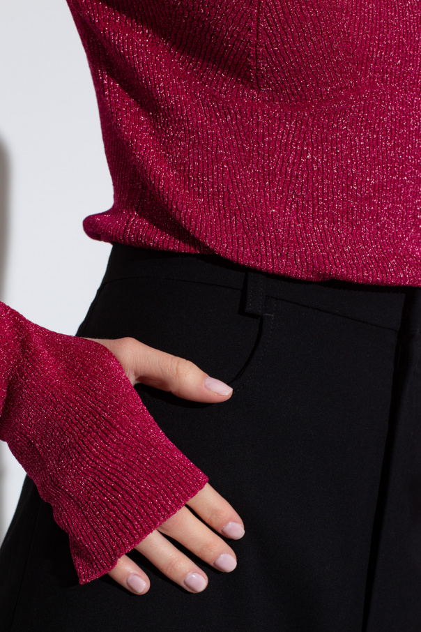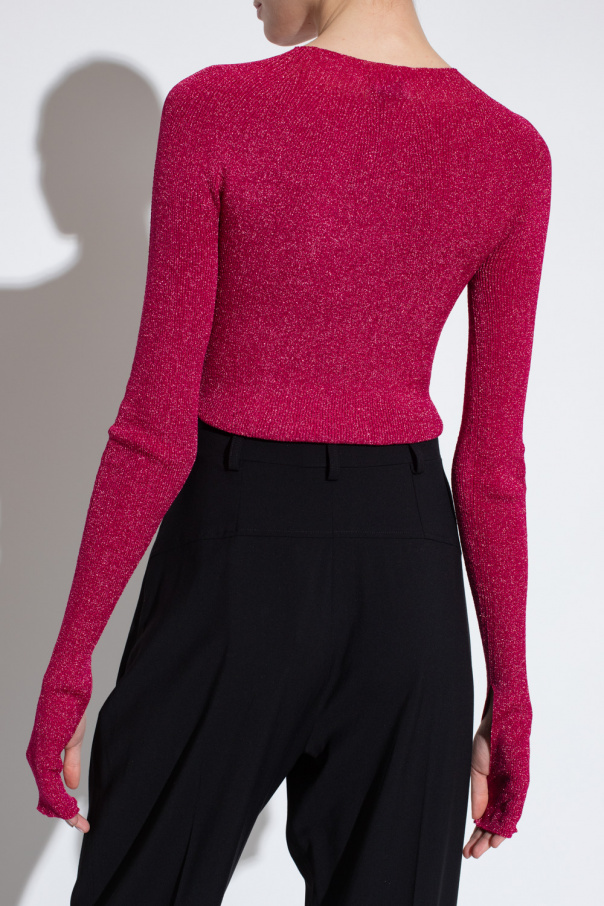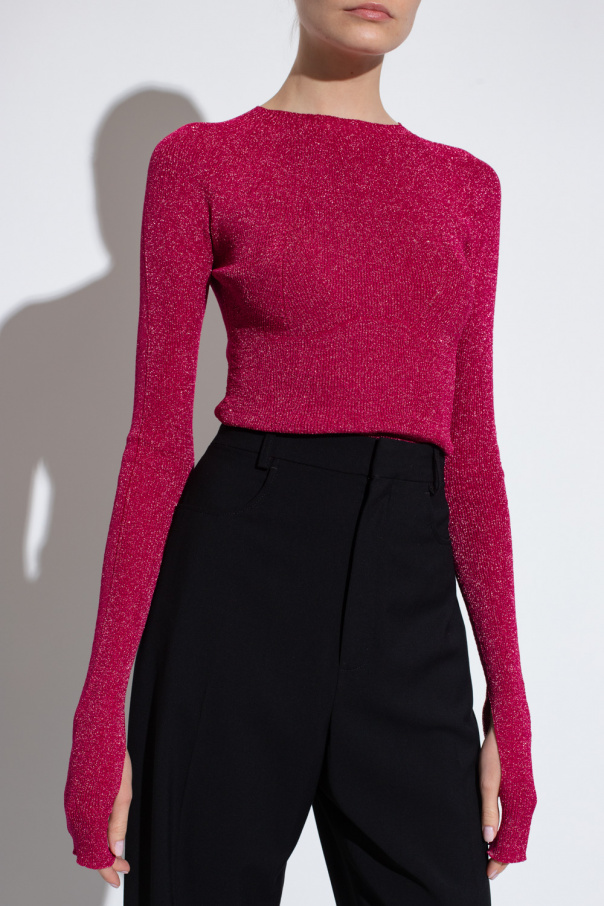 Pink fitted top from Lanvin. Inlaid with lurex threads, the round neck design has long sleeves with slits.