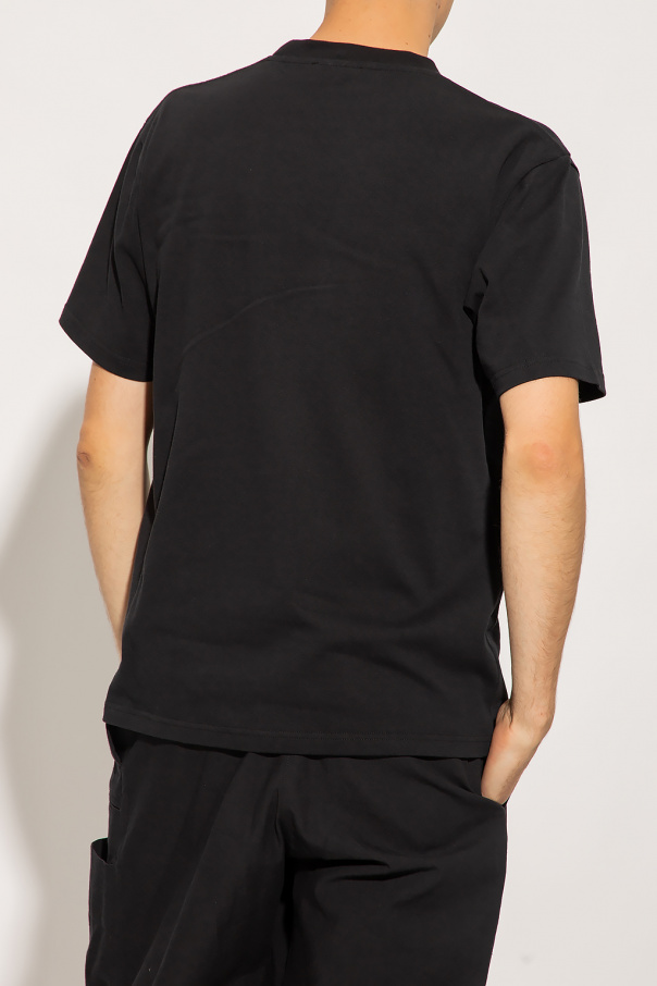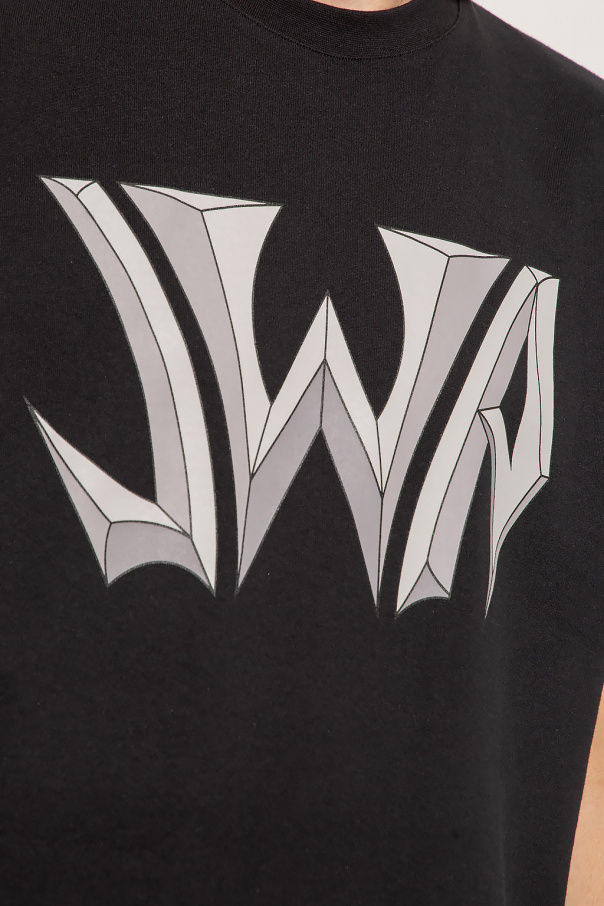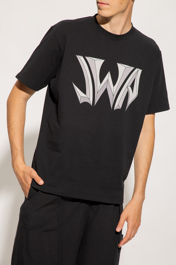 Black crewneck T-shirt from JW Anderson. Made from cotton, this style features short sleeves and colourful embroidery with the brand\'s logo on the front.