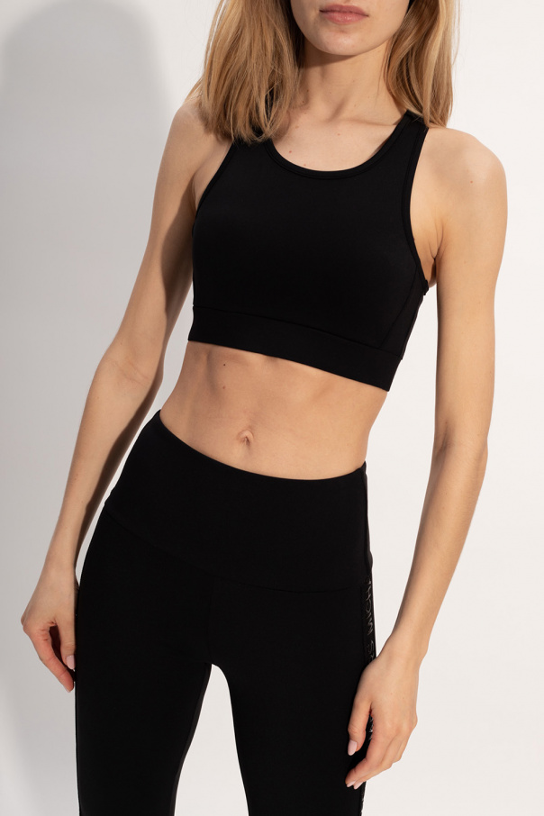 Black sports tank top from Michael Michael Kors. Crafted from recycled material, this style showcases an elasticated hem and a black, glistening logo printed at the back.