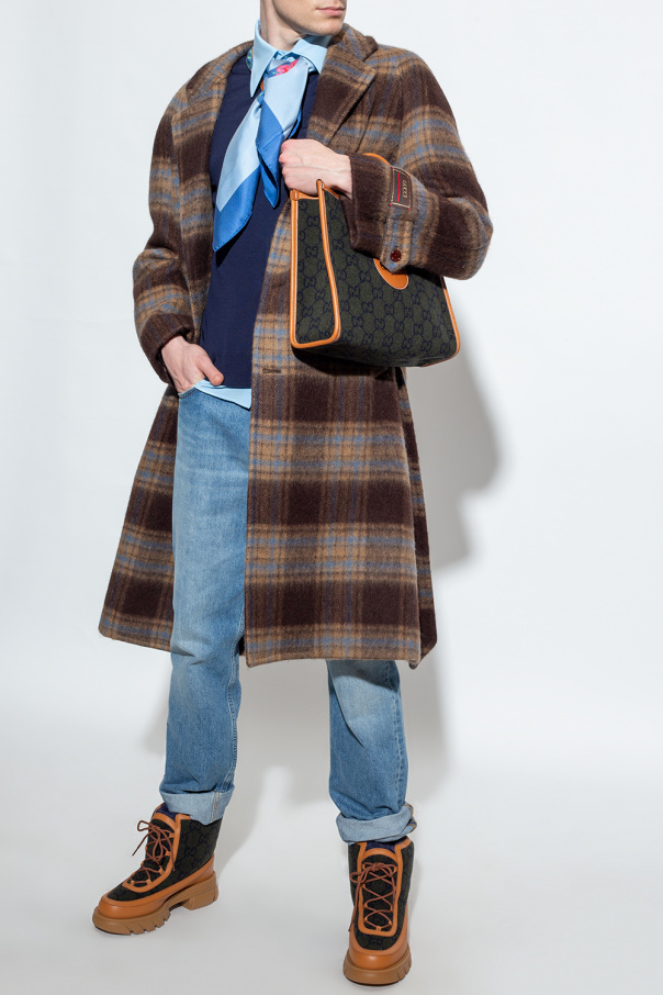 Light brown, dark green and navy blue snow boots from Gucci. Enriched by a monogram motif, this lace-up model sits on a beige rubber sole and features an elasticated cuff.