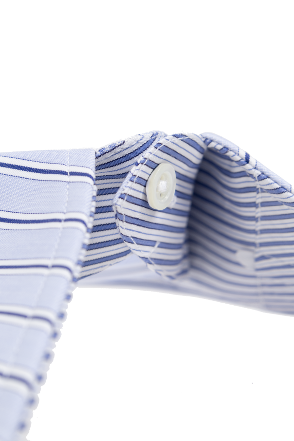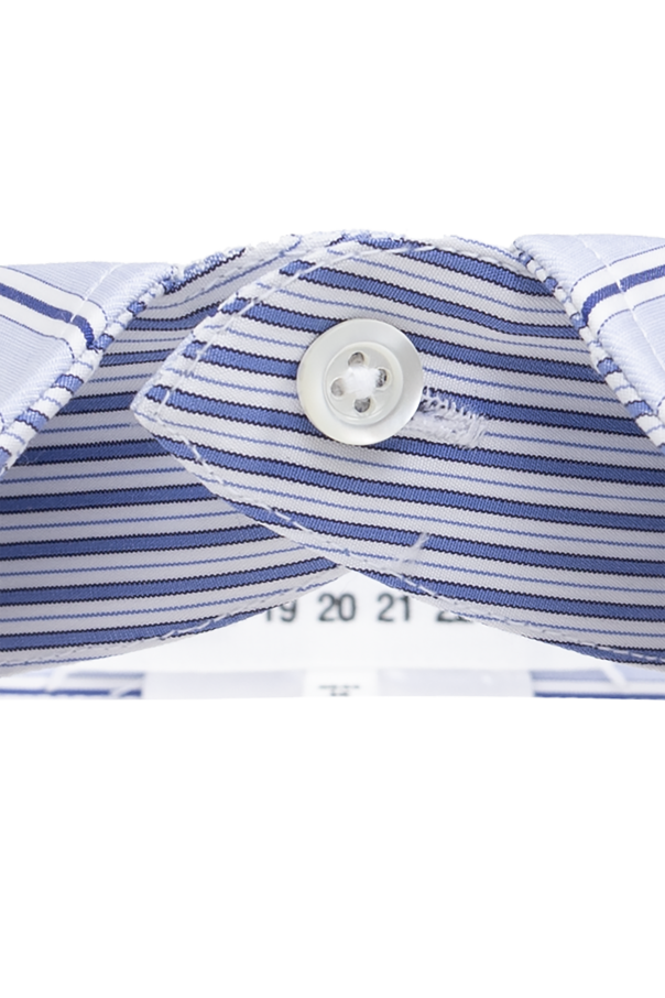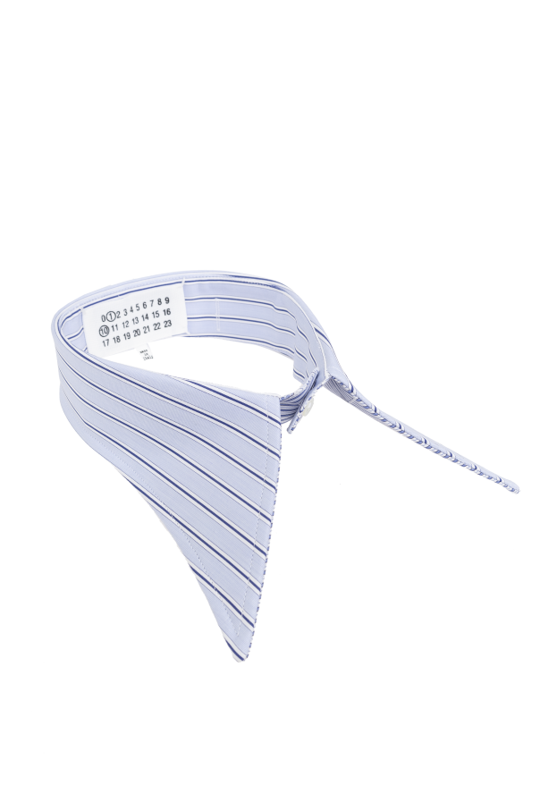 Introducing the Maison Margiela Striped Collar, a quintessential addition to the exclusive collection of one-piece clothing that effortlessly elevates formal attire. Crafted with precision, this collar boasts a classic pointed shape, synonymous with the timeless elegance of shirt collars. The collar is adorned with a sophisticated pattern of blue stripes set against a light background, lending it an air of refined formality. Its smooth texture hints at the luxurious blend of cotton and other fibers, promising not only style but also comfort. The attention to detail is further exemplified by the symmetrical white buttons that allow for secure and easy fastening. An inner side label provides essential information such as size, material composition, and care instructions, ensuring the collar\'s longevity and ease of maintenance. With its dominant hues of blue, light background, and contrasting white buttons, the Maison Margiela Striped Collar is an exquisite accessory for those seeking to add a touch of elegance to their formal wear without the need for a full shirt. Why Purchase This Product? Elegant and formal design with blue stripes that enhance any outfit. Made from a smooth cotton blend, offering both comfort and durability. Features symmetrical white buttons for a polished look and easy fastening. Part of an exclusive collection by the renowned Maison Margiela, adding a unique touch to your wardrobe.
