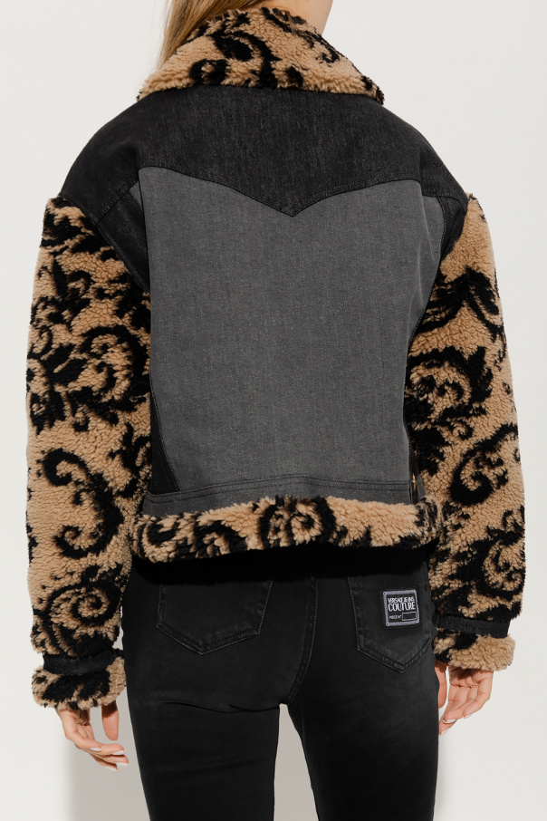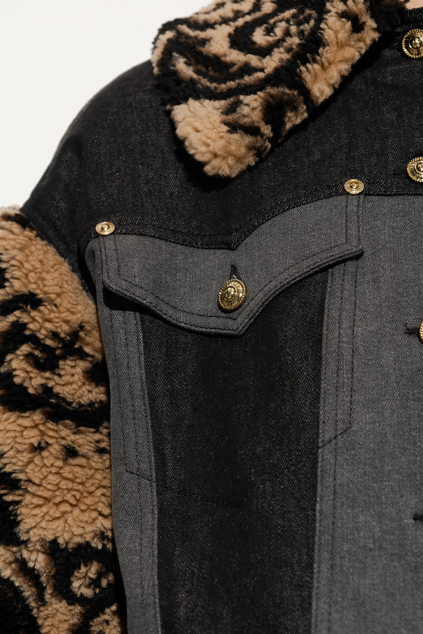 Grey and black jacket from Versace Jeans Couture. Crafted from cotton, this style features gold-tone button fastenings with an embossed logo, two flapped pockets and faux fur trimming with an animal motif.