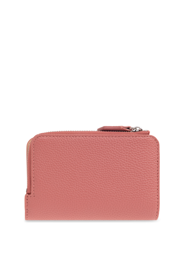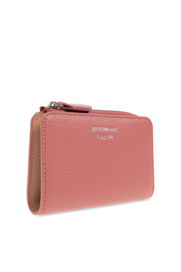 Pink folding wallet from Emporio Armani. Made of faux leather, this item fastens via a snap and showcases an embossed silver-tone logo on the front. It is complete with one zip pocket as well as a beige-clad interior with one bill pocket, two slip pockets and six card slots.