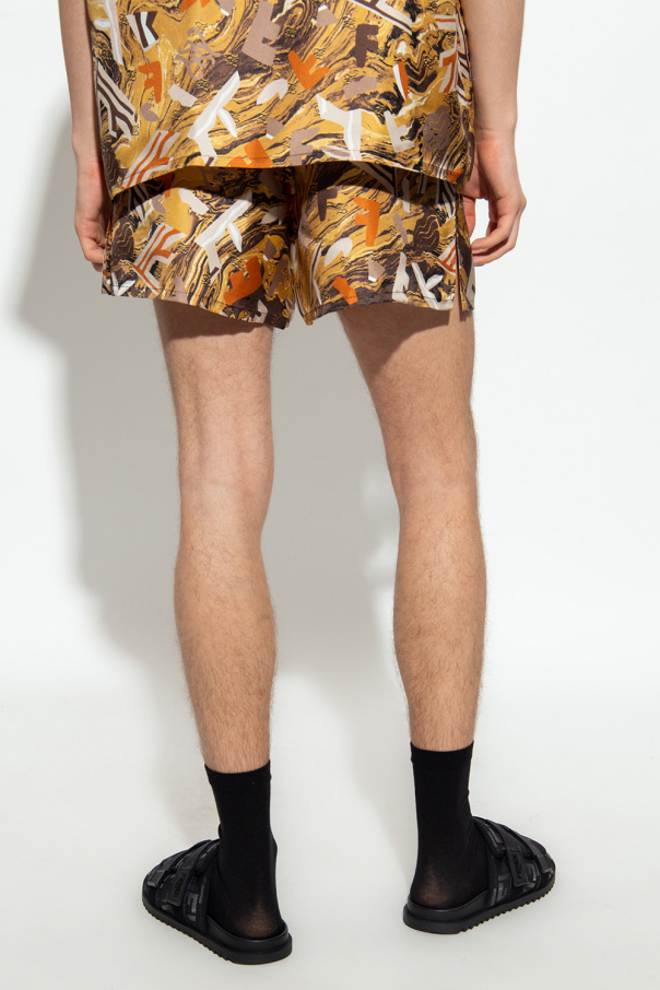 Yellow, orange and brown shorts from Fendi. Made of silk and decorated with a graphic pattern, this pair features an elasticated waistband, a black and cream logo patch and three slip pockets.