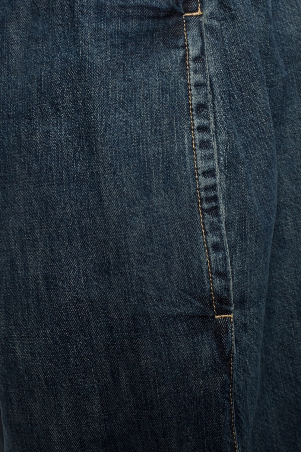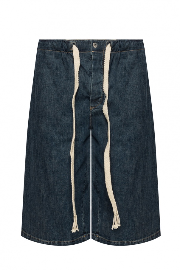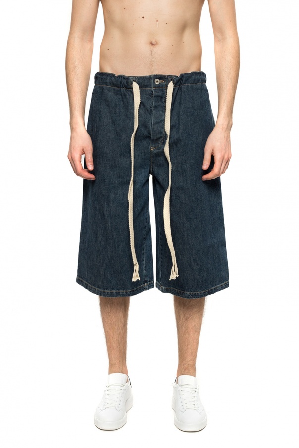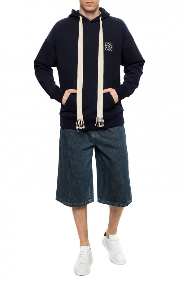 Blue denim shorts from Loewe. Fastened with buttons and long decorative drawstrings. Enriched by a beige logo embroidery. Two pockets on the front, one at the back.