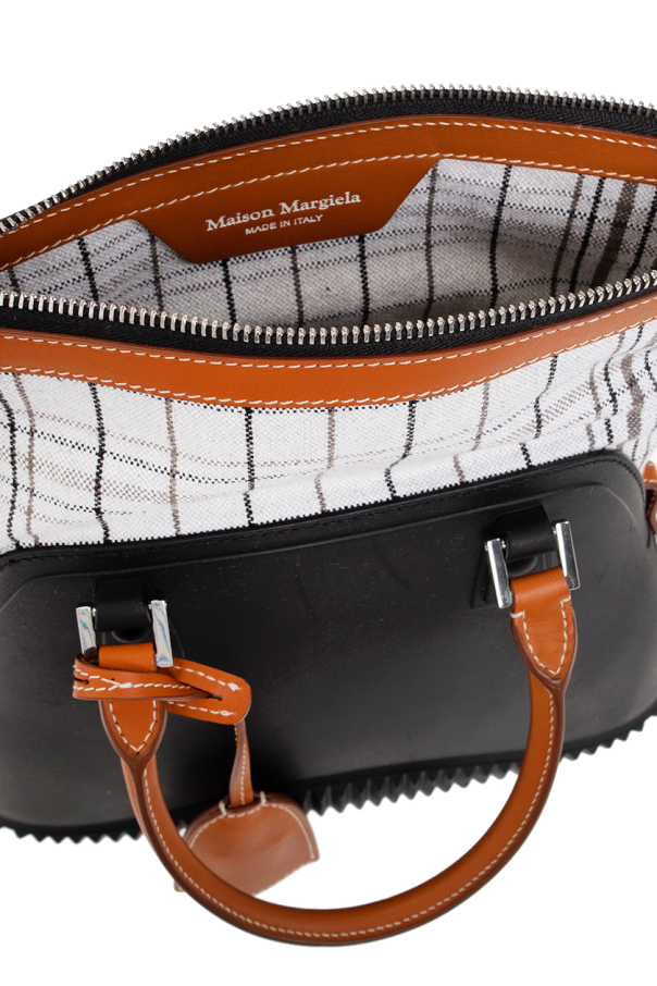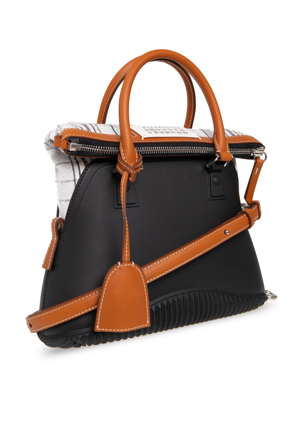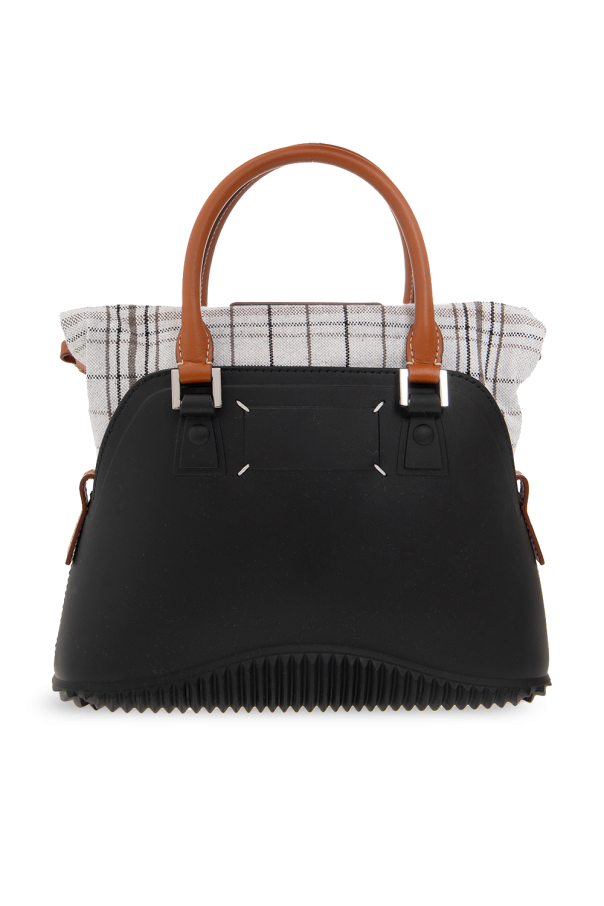 Black, grey and brown \'5AC Mini\' shoulder bag from Maison Margiela. Embellished with a check pattern and white and black logo patch, this design secures with a zip and features two half-round handles, a detachable and adjustable shoulder strap, silver-tone metal hardware and one internal compartment with a slip pocket.