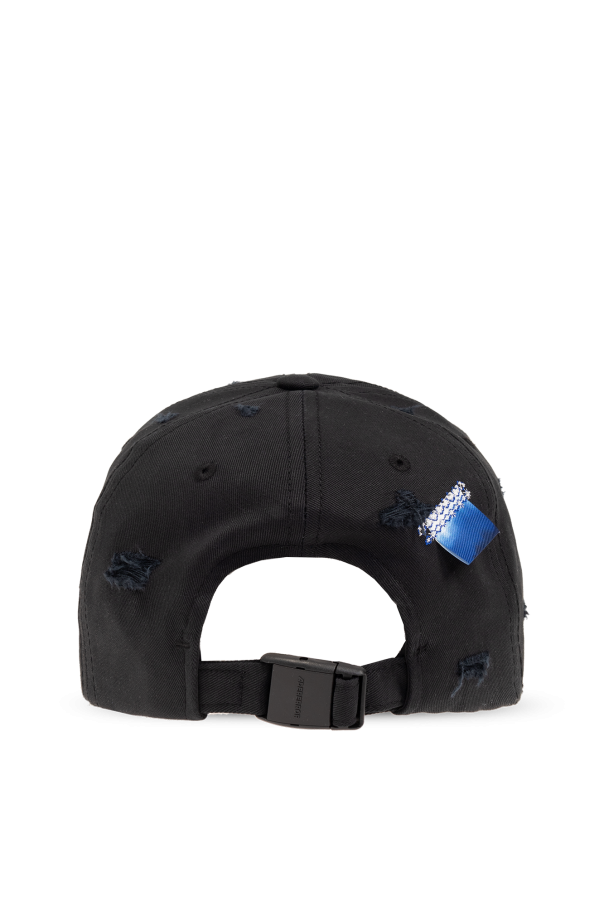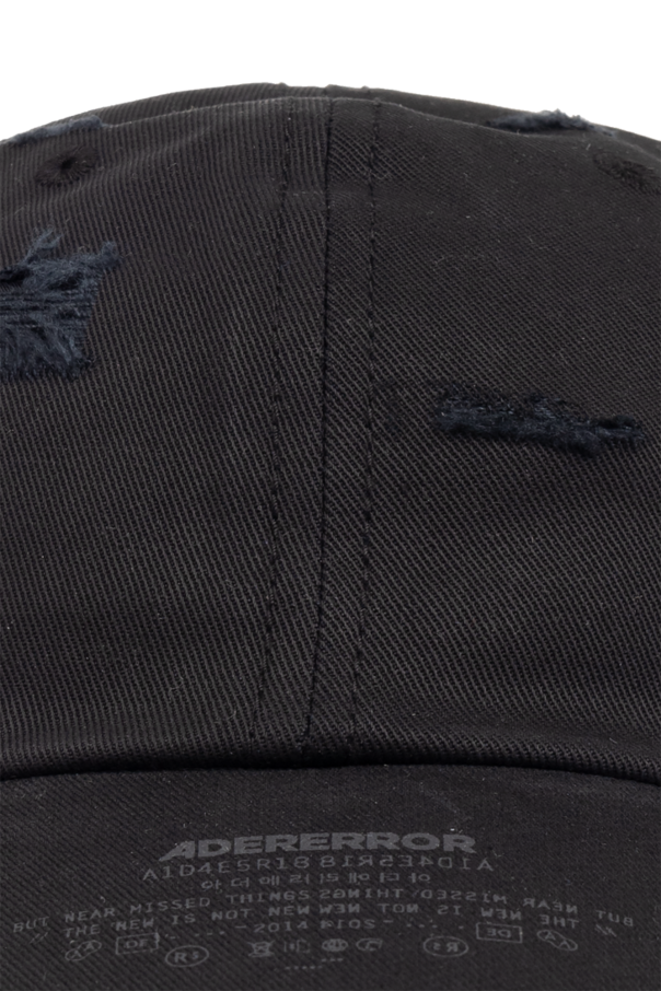 Introducing the epitome of urban sophistication: the Ader Error Baseball Cap. Crafted with meticulous attention to detail, this cap is presented in a subdued black hue, offering a versatile addition to your contemporary wardrobe. Featuring a classic rounded visor construction, the cap is distinguished by its deliberately aged appearance, with fine, intentional distressing and subtle, irregular stitching that serve as decorative elements. The front of the cap proudly displays the Ader Error logo, making a bold statement, while the adjustable strap at the back, equipped with a plastic closure, ensures a perfect fit for all head sizes. A distinctive blue tag on the rear further identifies this piece as a coveted item from the renowned designer\'s collection. Made from a harmonious blend of cotton and rayon, this cap promises not only style but also unparalleled comfort and durability. Why Purchase This Product? Elegance and versatility in a timeless black color. Unique aged effect for an edgy, stylish look. High-quality materials ensuring comfort and longevity. Adjustable size for a universal, snug fit. Signature Ader Error branding for an exclusive touch.