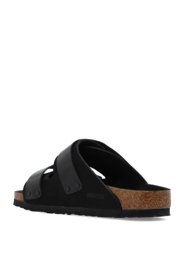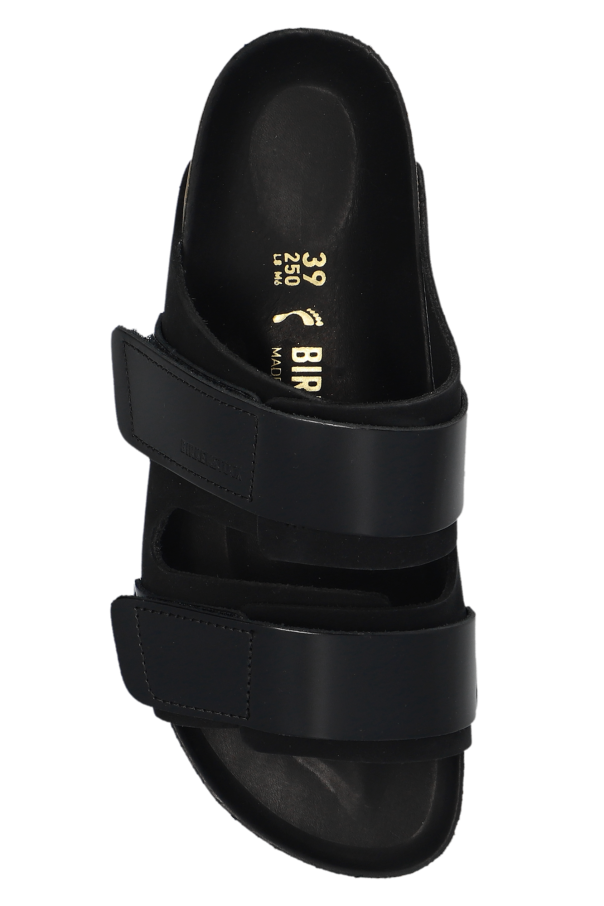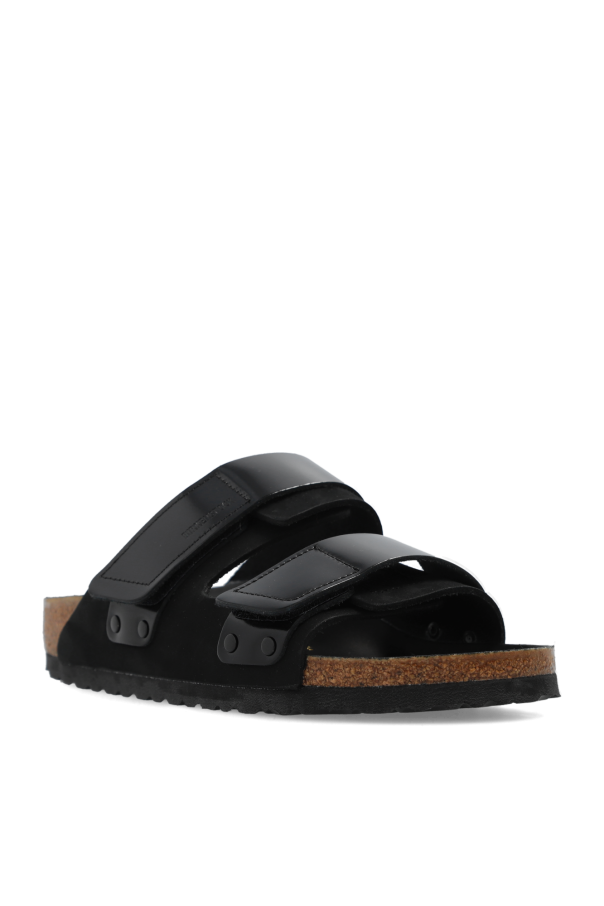 Black ‘Uji’ slides from Birkenstock. Made of nubuck and polished leather, this pair features velcro fastenings, an embossed logo, tapered anatomically-shaped cork-latex footbed as well as a brown and black sole constructed from natural cork and EVA foam.