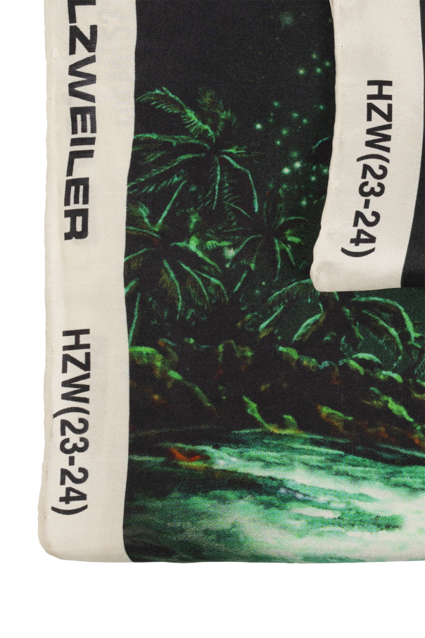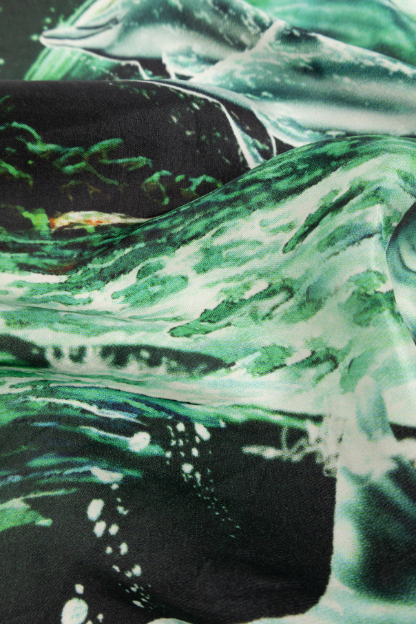 Green, black and cream shawl from Holzweiler. Made of silk, this item showcases a pattern with dolphins accompanied by the brand\'s logo.