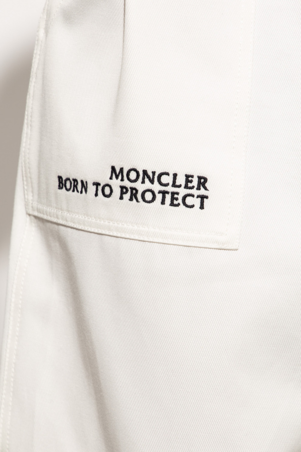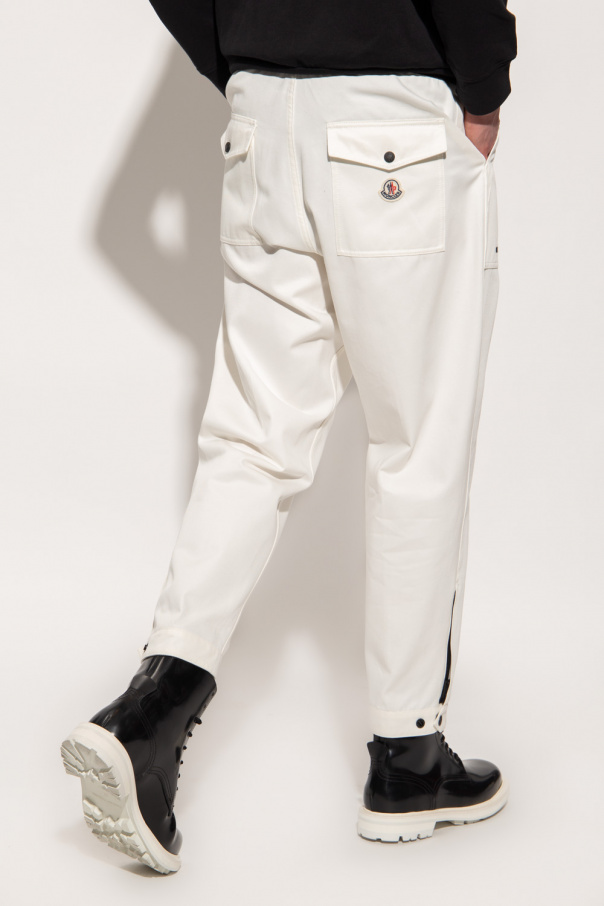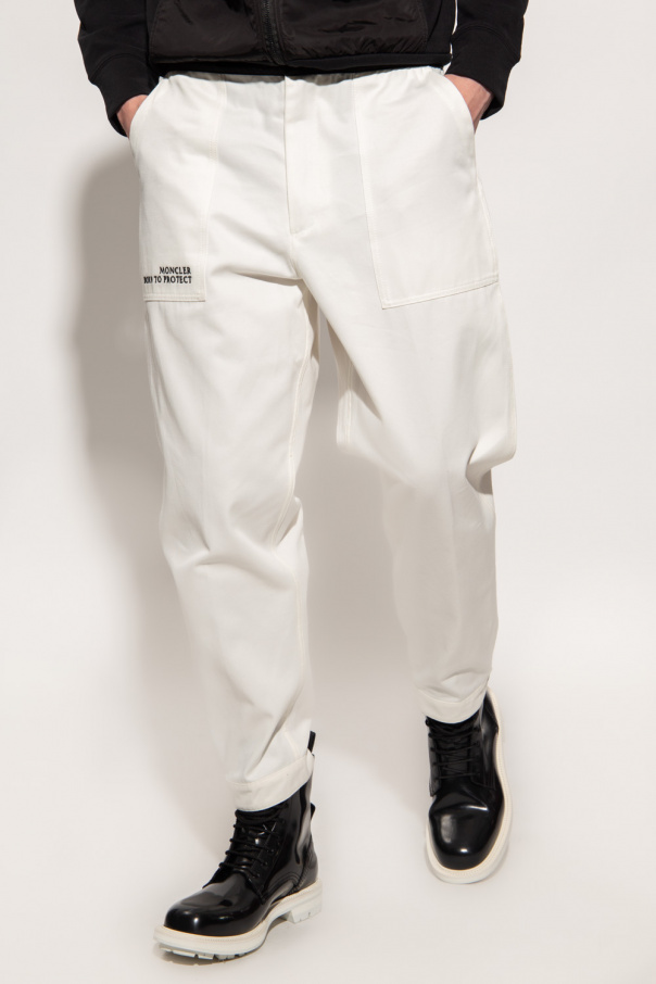 White and black trousers from Moncler. Crafted from cotton, this pair falls with slightly tapered legs and features logo & ‘Born To Protect’ embroidery, two front slip pockets, two snap-fastened flapped back pockets and snap closures on the cuffs.