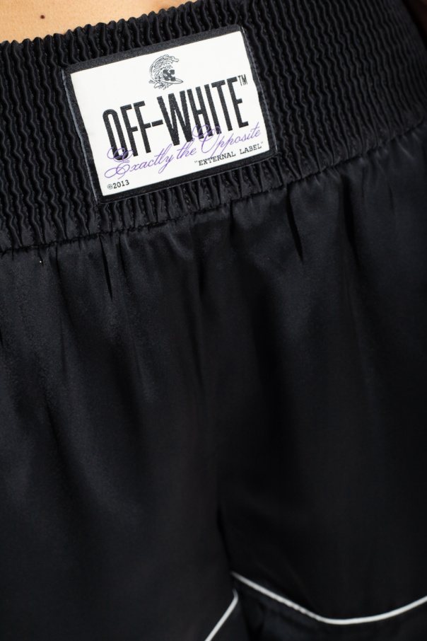 Black pyjama trousers from Off-White. This pair features an elastic waistband, logo patch, two slip pockets and white trimming.