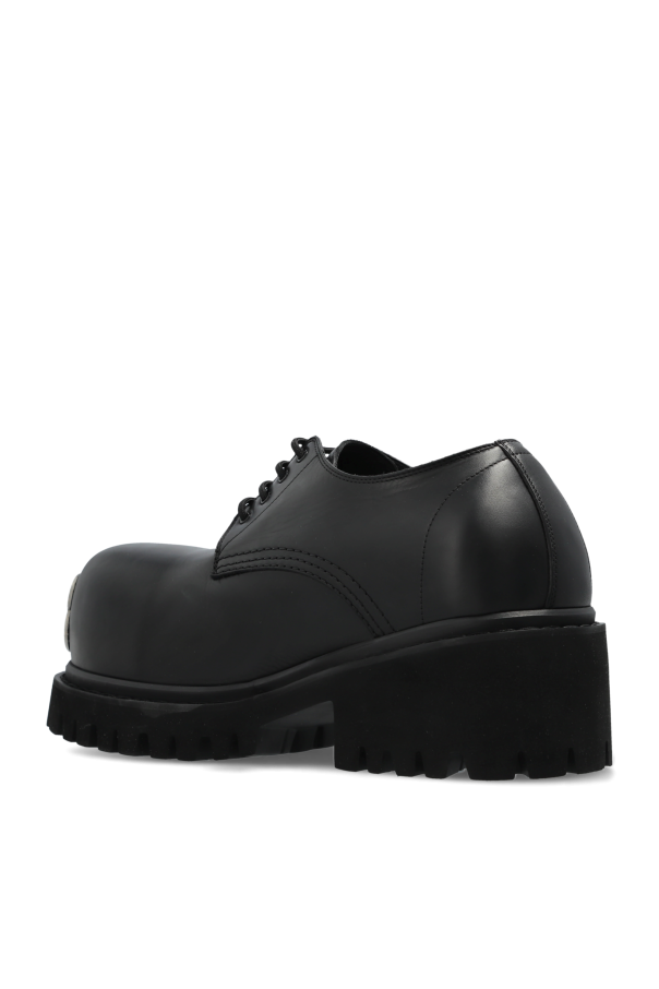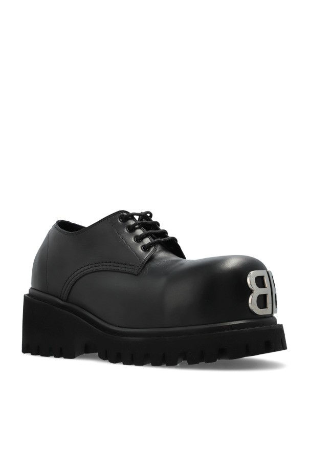 Discover the quintessence of modern elegance with the Stomper leather shoes, a remarkable creation from the esteemed house of Balenciaga. Crafted from sumptuous black leather, these shoes epitomize sophistication and audacity. The robust, thick rubber sole with a pronounced tread ensures a commanding presence, while the silver-toned metal logo adorning the front elevates their distinctive allure. The lace-up design, a hallmark of classic refinement, guarantees an impeccable fit. Marrying the timeless with the avant-garde, the Stomper shoes are an embodiment of Balenciaga\'s commitment to sartorial excellence and contemporary innovation. Why Choose This Product? Exquisite craftsmanship from a legendary fashion house. Durable design with a striking, modern aesthetic. Perfect fusion of classic style and avant-garde elements. Distinctive silver logo for a touch of luxury. Ensures comfortable fit with lace-up closure.