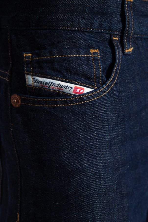 Navy ‘Widee’ jeans from Diesel. Crafted from a cotton and linen blend, this high-waisted pair falls down with wide legs and is complete with a zip fly and button, two front pockets and two back pockets.