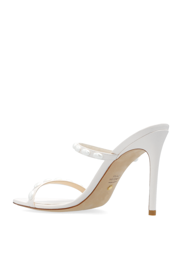 Cream ‘Aleena Pearlita’ mules from Stuart Weitzman. Made from leather with a square toe, this model sits on a beige leather sole and features straps bejewelled with white faux pearls.