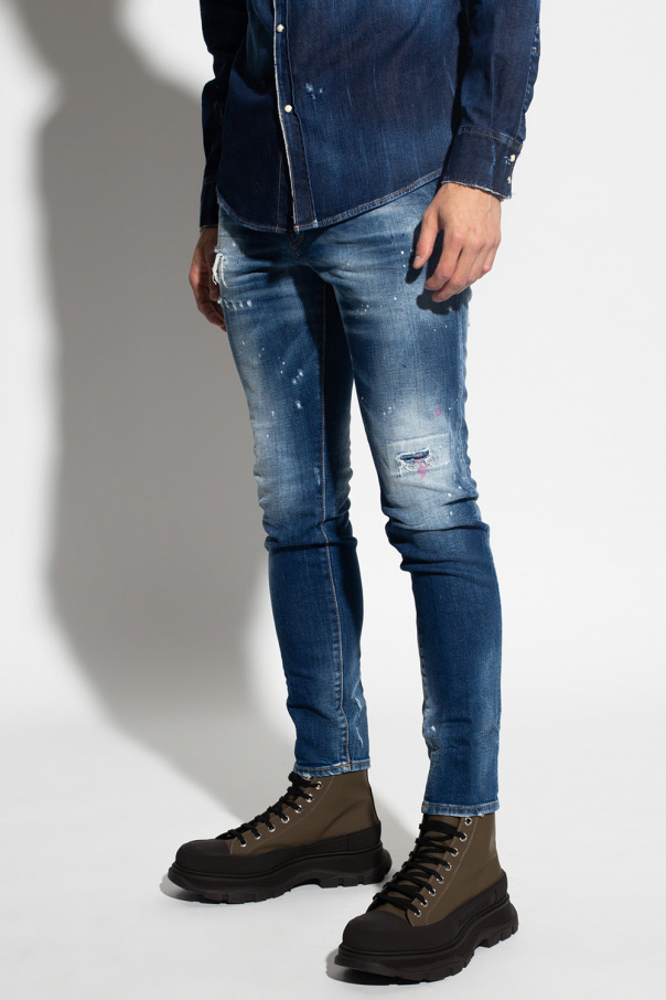 Blue \'Skater\' jeans from Dsquared2. Crafted from stonewashed stretch-cotton denim, this pair falls down with tapered legs and features button fastenings, yellow stitching details, blue and white paint splatters, classic five pockets, frayed edges and a black patch with a red and grey logo at the back.